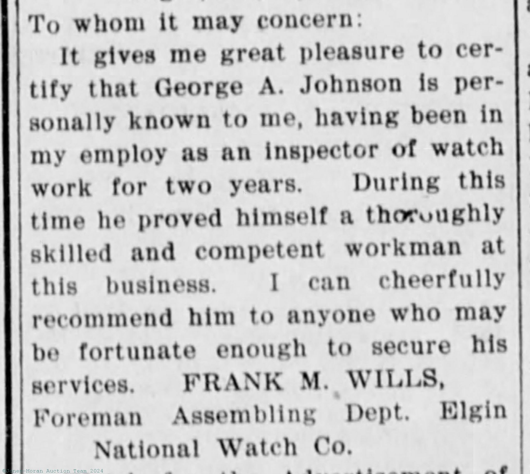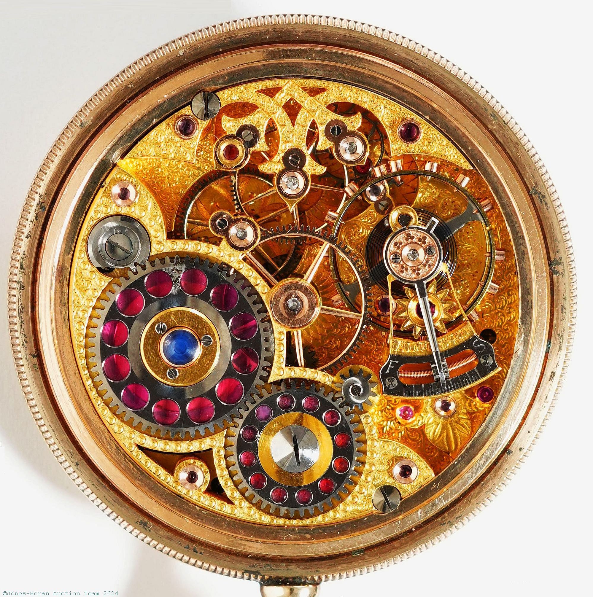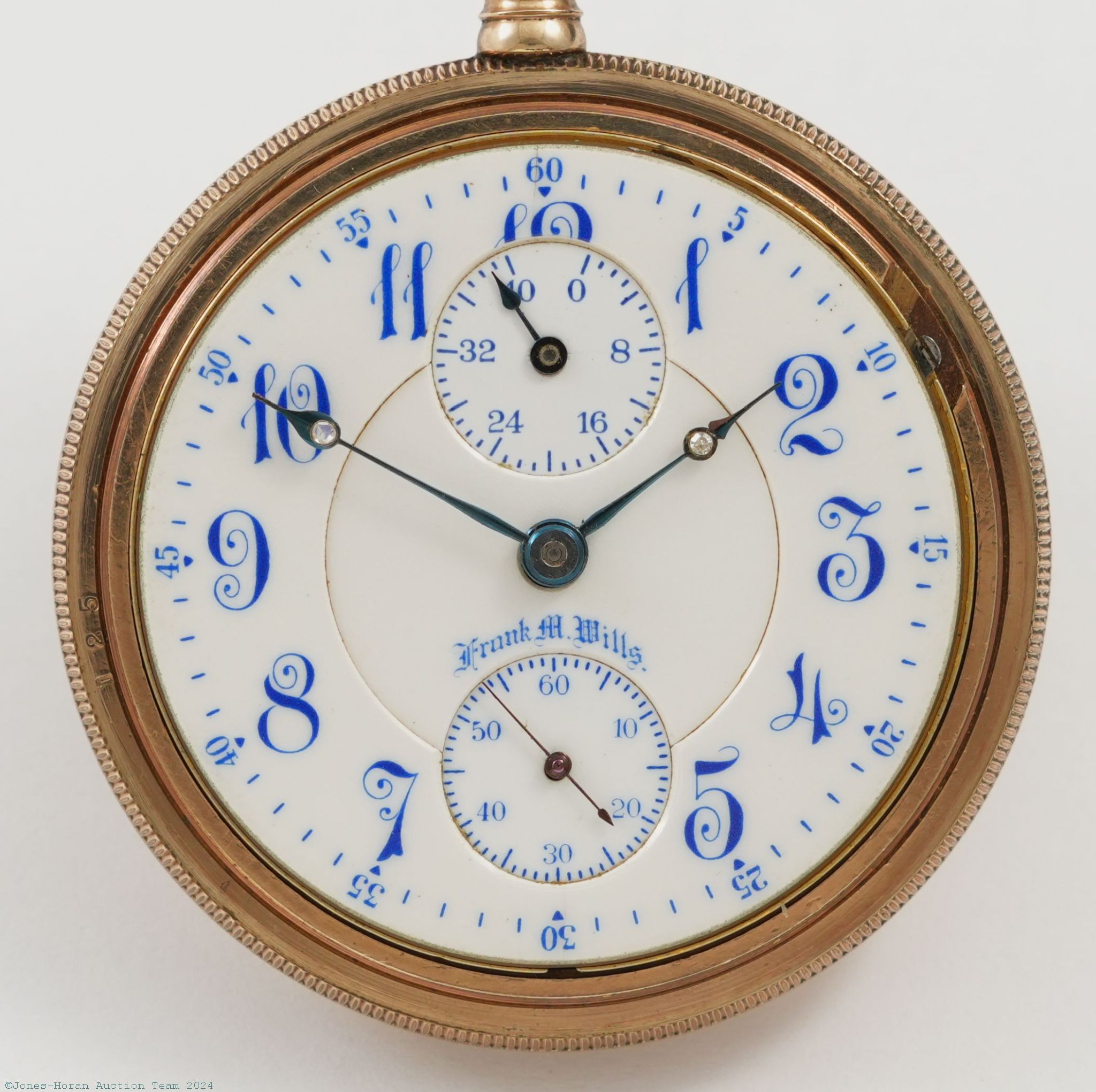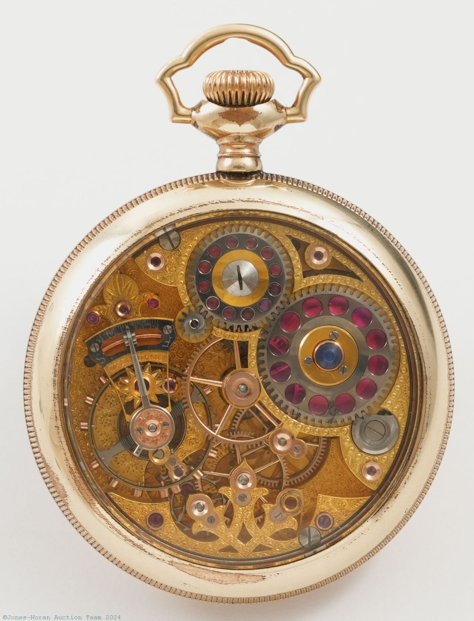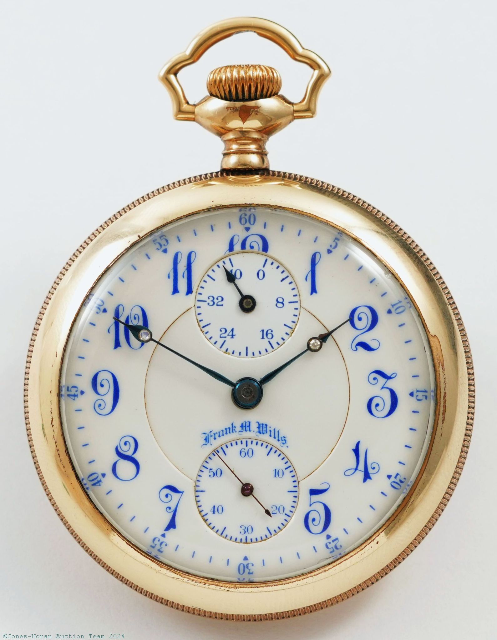 APW - Elgin, personal watch of Elgin Watch Co. assembling department foreman Frank M. Wills, unique highly engraved and ornamented top grade mvt with winding indicator, 64 jewel (31 jewels are functional or semi-functional, 33 jewels are entirely cosmetic), 18S, gold-filled OF display recase, cream colored enamel triple-sunk dial with all markings in royal blue, hour and minute hands with inset jewels, seconds-hand with a jewel set over its hub, fully capped lever escapement, diamond cap jeweling to balance, escapement, and train, jeweled barrel arbor with blue sapphire cap jewel, cabochon rubies set around winding wheel perimeters, cosmetic cap jeweling over plate screws and balance cock screw, several additional purely cosmetic jewels including one set within counterpoise of lever, ornately engraved and pierced gilt plates and balance cock, no visible serial number. A truly unique and mind blowing piece with a movement aesthetic that is worlds apart from anything we have ever encountered among American horology. Some of the delightfully over-the-top detail that this cataloger particularly appreciates are the transparent red ruby cabochon "windows" through the ratchet wheel, the presence of a red ruby set within the counterpoise of the lever that skips back and forth as the watch runs, and the presence of magnificent ornate engraving detail to the visible portion of the dial plate below the train wheels. Frank M. Wills (1857-1928) was foreman of Elgin Watch Co.'s assembling department, and please see our final photo for an entry listing this position that is found in the December 4th, 1908 issue of the periodical Weekly Rogue River Courier of Grant's Pass, Oregon. The present watch represents the ultimate "show off" piece for an individual in Wills' position to demonstrate the finish and artistry that his firm was capable of producing.