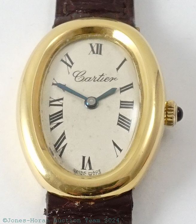 LWW - Lady's Cartier Baignoire, manual wind, 21mm x 30mm to lug tips, original 18K yellow gold snap back case with screwed lugs, brown leather strap, original white oval dial with black painted Roman numerals, 17J movement signed Bueche Girod, s#106858, triple signed. Gross weight of assembled watch 14.2 dwt (22.1 g).
