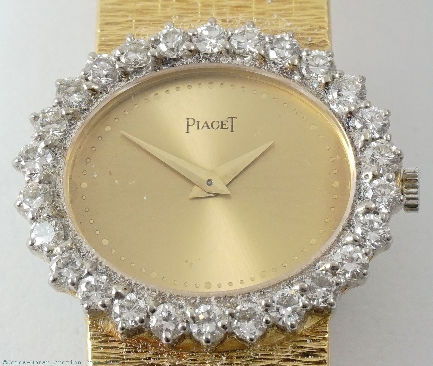 LWW - Lady's Piaget, ref 9326, manual wind, 27mm x 24mm to lug tips, original 18K yellow gold screwed back case with round brilliant cut diamond bezel, integrated bracelet with bark textured finish signed Piaget, watch measures 6.5 inches in length, original champagne dial with black painted Roman numeral indices, 18J cal 9P2, case s#329032, mvt s#7905000, triple signed. Gross weight of assembled watch without movement 43.0 dwt (66.9 g). Includes its original Piaget presentation box.