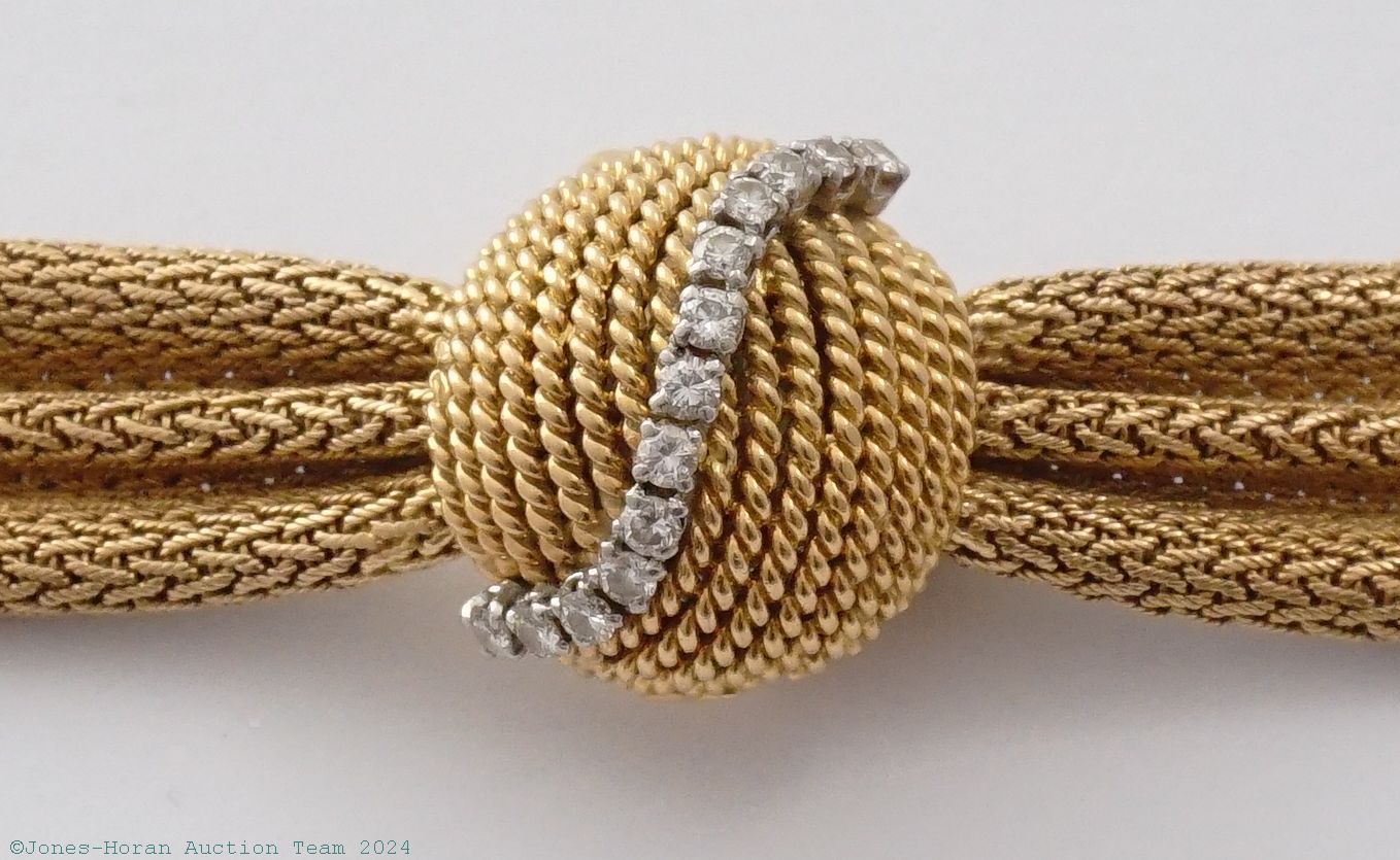 LWW - Lady's Omega, manual wind, 17mm x 17mm to lug tips, original 18K yellow gold snap back case with back set crown and flip top set with diamonds, set with 13 round brilliant cut diamonds, integrated bracelet with textured finish, watch measures 6.75 inches in length, original silvered dial with applied gold indices, s#455183, triple signed. Gross weight of assembled watch 23.0 dwt (35.9 g). Includes generic red presentation box.