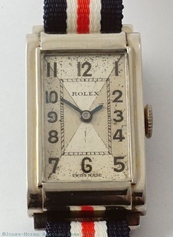 LWW - Lady's Rolex Tank, ref 1852, circa 1930s, manual wind, 17mm x 31mm to lug tips, 11mm wire lug width, original 14K white gold snap back case with ribbed case top, one piece strap, original silvered dial with quadrant finish and black painted numerals, 17J Extra Prima, s#8692, triple signed. Gross weight of assembled watch without strap 8.9 dwt (13.8 g).