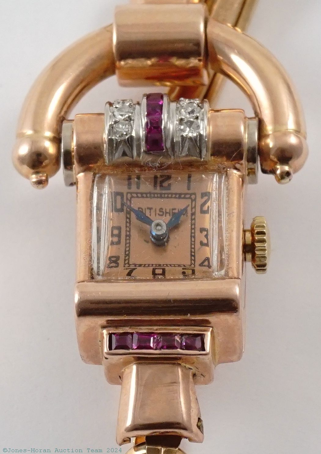 LWW - Lady's Paul Ditisheim cocktail watch, manual wind, 26mm x 55mm to lug tips, original 14K rose gold snap back case set with diamonds and rubies, thin gold-filled bracelet, refinished salmon dial with black painted numerals, 17J, no s# available, triple signed. Gross weight of assembled watch 16.0 dwt (25.0 g).
