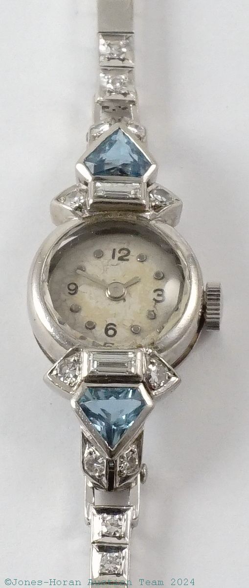 LWW - Lady's Swiss cocktail watch, manual wind, 15mm x 34mm to lug tips, original palladium snap back case set with diamond and two shaped aquamarines, integrated 14K white gold bracelet set with diamonds, watch will fit up to a 6.5 inch wrist comfortably, silvered dial with applied silver indices, 17J, s#017932, triple signed. Gross weight of assembled palladium and 14K gold watch 10.1 dwt (15.7 g).