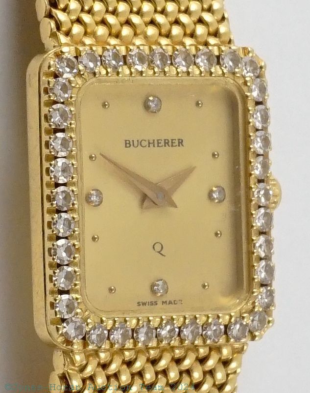LWW - Lady's Bucherer, quartz, 17mm x 20mm to lug tips, original 18K yellow gold screwed back case with diamond set bezel, integrated 18K gold bracelet, original champagne dial with applied gold and ball indices, no s# available, triple signed. Gross weight of assembled watch 34.5 dwt (53.7 g).