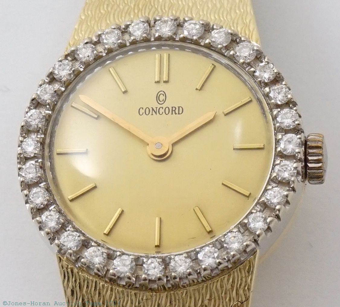 LWW - Lady's Concord, manual wind, 22mm x 22mm to lug tips, original 14K yellow gold snap back case with diamond set bezel, integrated bracelet in 14K yellow gold, original champagne dial with applied gold indices, 17J. Gross weight of assembled watch 20.1 dwt (31.3 g).