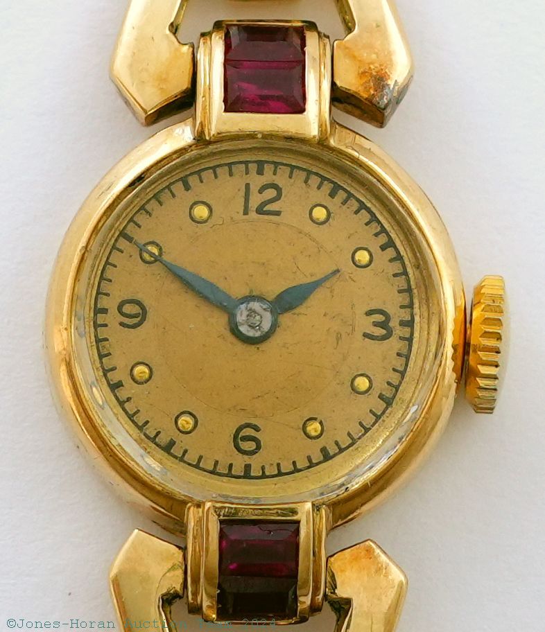LWW - Lady's Swiss bracelet watch, manual wind, 16mm x 23mm, 18K yellow gold snap back case set with rubies, integrated 18K yellow gold bracelet set with matching rubies, bracelet will fit up to 6 inch wrist in the current configuration, extra links which are included will add up to 0.75 inches in length, champagne dial with applied gold ball indices, 17J, no s# available. Gross weight of assembled watch and extra links 24.1 dwt (37.4 g).
