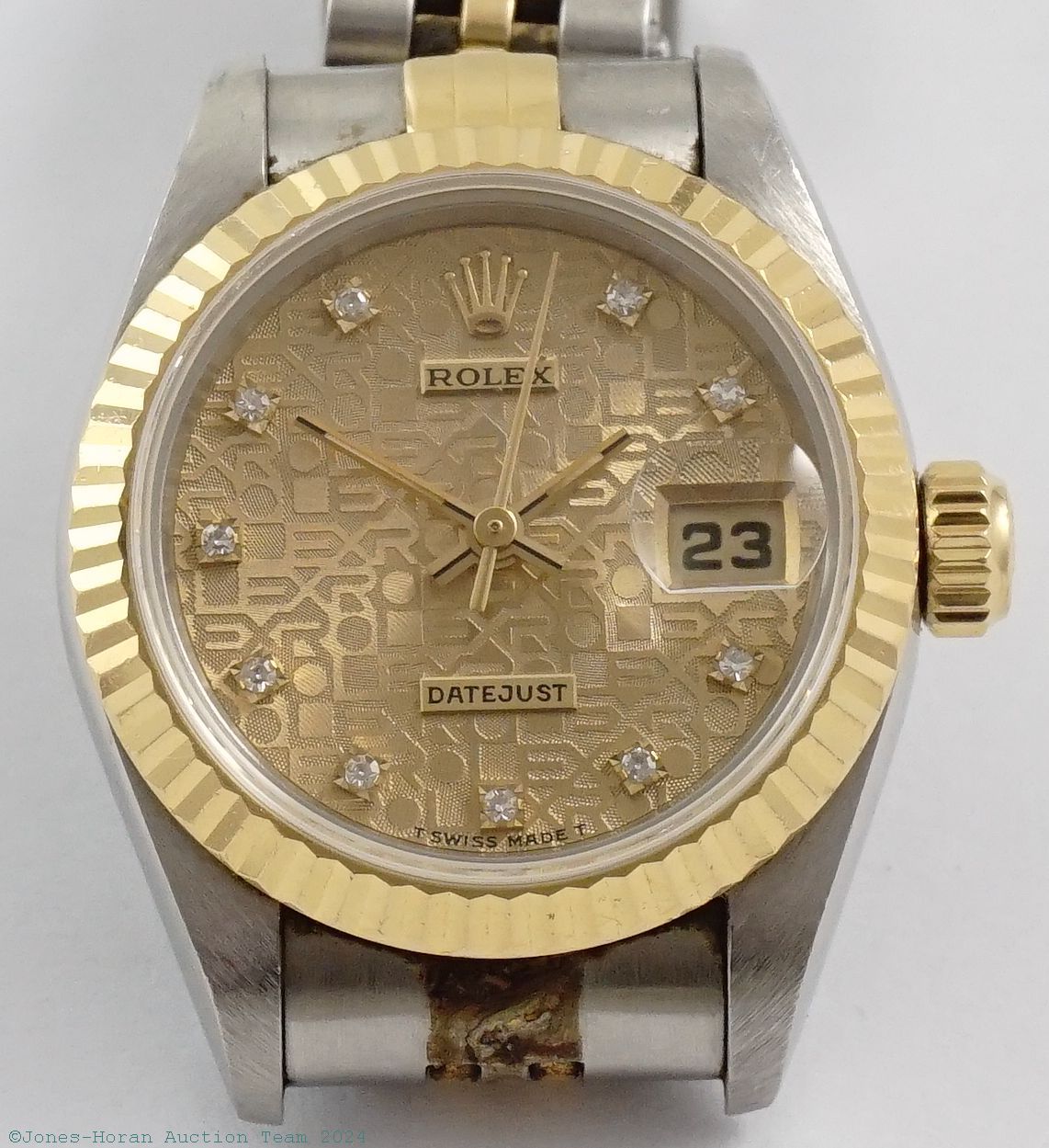 LWW - Lady's Rolex Oyster Perpetual Datejust, ref 69173, circa 1995, 26mm x 33mm to lug tips, 13mm lug width, original stainless steel screw back Oyster case with 18K gold fluted bezel, stainless steel and 18K gold Jubilee bracelet signed Rolex, original two-tone Rolex logo dial with applied gold diamond indices, date aperture at 3, 29J cal 2135, QS, s#W491162, triple signed with signed clasp, inside back ref 69000A, bracelet ref 62523D-18 with 468B end links and a W6 date code. Includes the original inner boxes, manuals and paperwork.