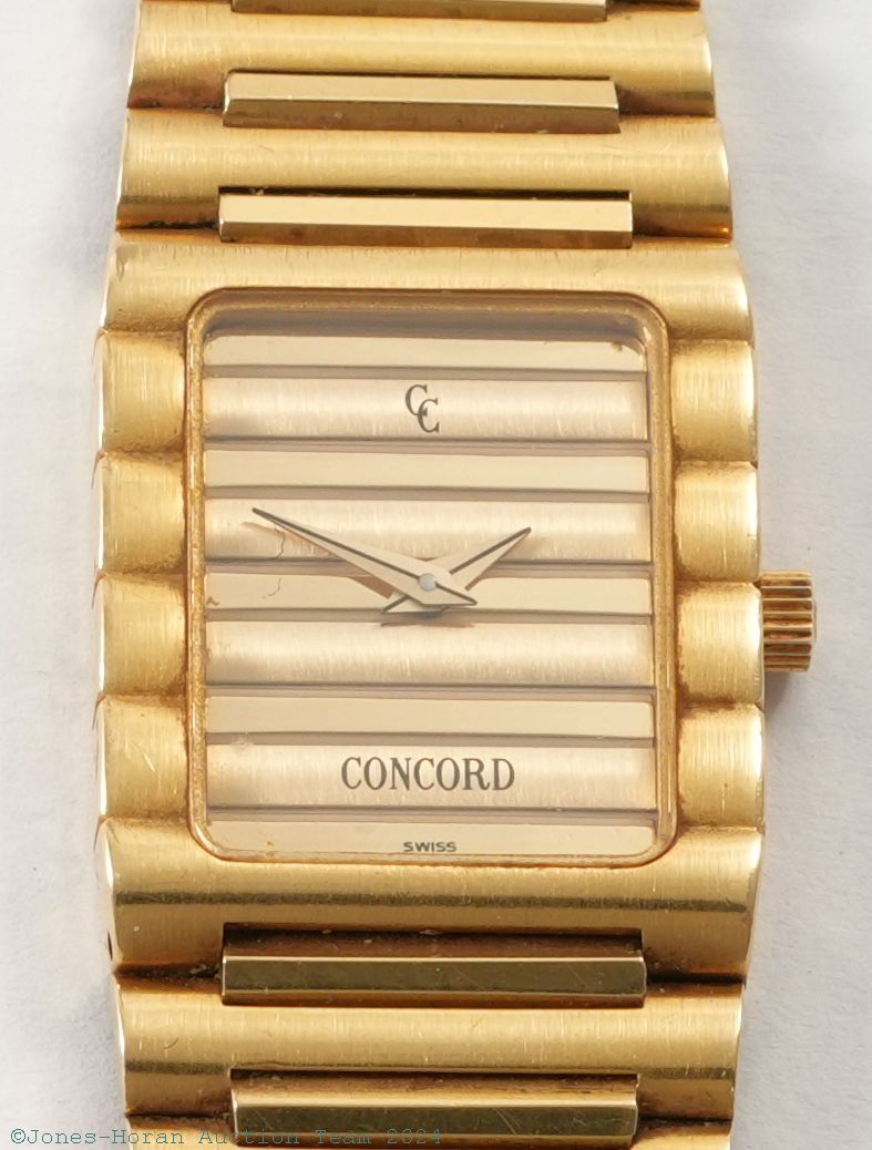 LWW - Lady's Concord, quartz, 19mm x 21mm to lug tips, original 18K yellow gold screwed back with ribbed case design, integrated bracelet with matching design in 18K gold signed Concord, original gold dial with matching texture to case and bracelet, s#597484, triple signed. A great alternative to the immensely popular Piaget Polo. Gross weight of assembled 18K gold watch 40.4 dwt (63.1 g). Includes the original inner and outer boxes as well as manual, paperwork and hang tags.