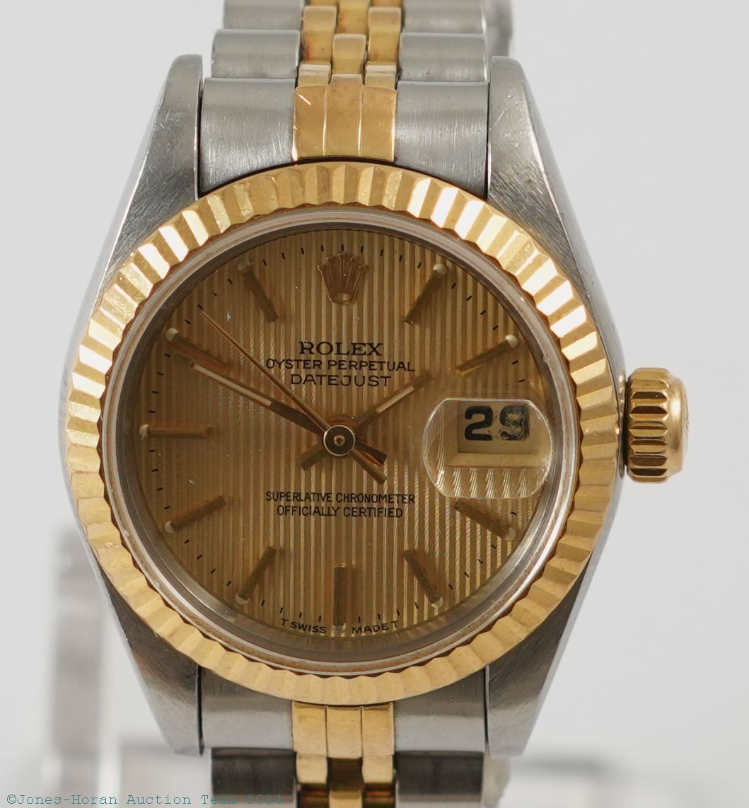 LWW - Lady's Rolex Oyster Perpetual Datejust, ref 69173, circa 1995, 26mm x 32mm to lug tips, 13mm lug width, original stainless steel screw back Oyster case with gold fluted bezel, original two-tone Jubilee bracelet signed Rolex, original champagne tapestry dial with applied gold indices, date aperture at 3, 29J cal 2135, s#W777813, triple signed, bracelet code W10 for 1995, inside back ref 69000A. Includes a period inner and outer box as well as manuals and paperwork with a very close but different serial number.