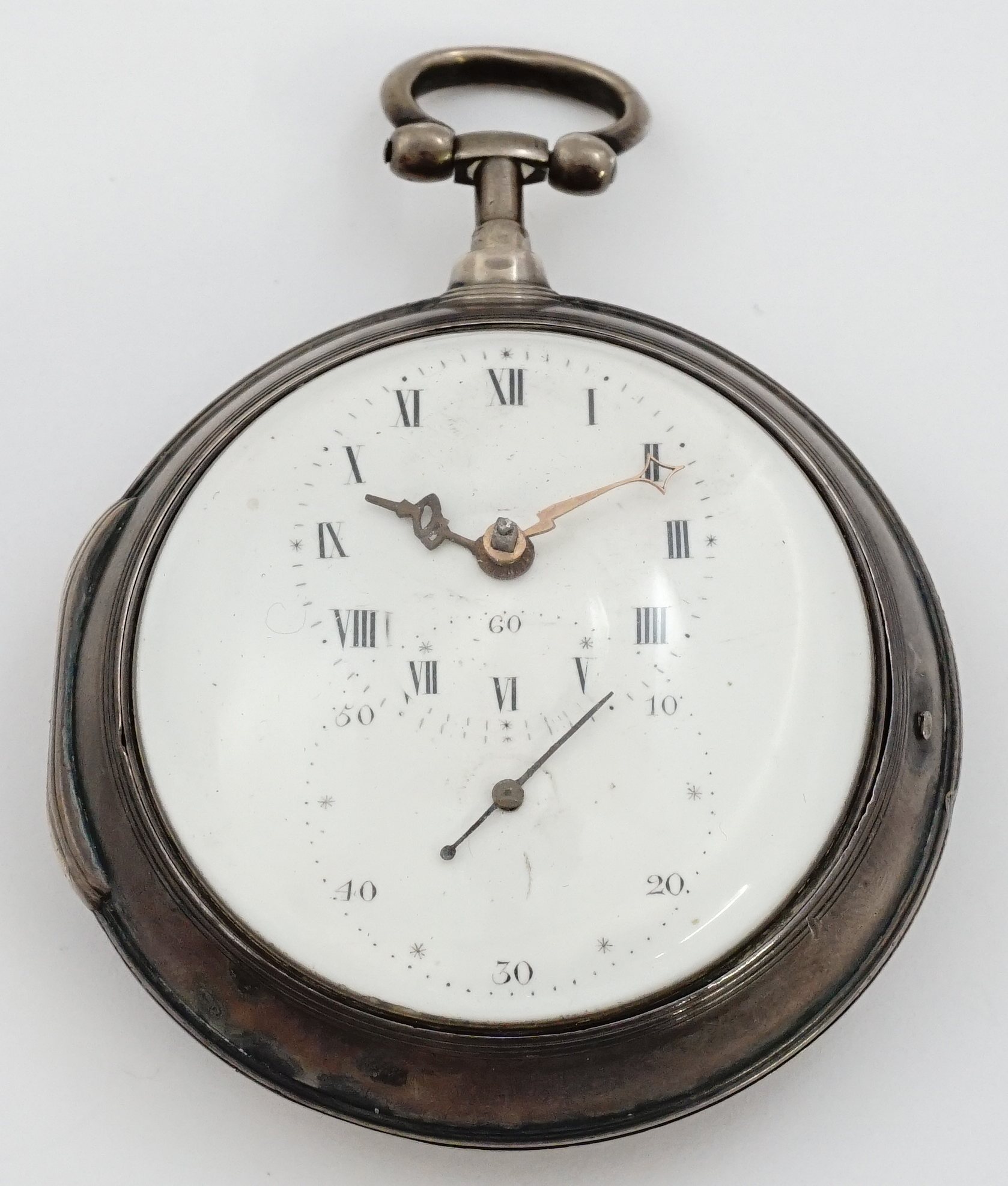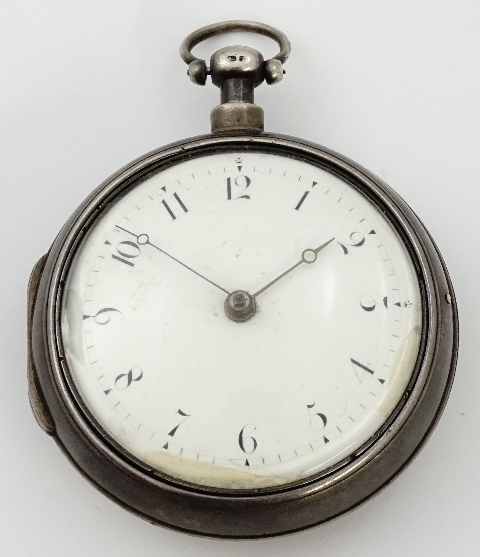 Mvt: NR, chain is present but fusee will not turn to wind, balance will tick with some reverse pressure given at fusee, overhaul needed and we suspect that the rigidity of fusee may be as often occurs when old shark or whale oil hardens up on the internal fusee clicks, excellent cosmetic mvt condition overall, few fine scratches, some clouding and smudge of plate surfaces that may improve with a cleaning; dial with flake at center, hl from 4 to 5, some fine scratches; excellent hands; outer case shows very light wear, an attractive dark patina, some mild fine scratches, mild dent to lower right perimeter of rear, few mild dings to left center of rear, button latch good though with button dented; inner case shows very little wear, shallow circumferential denting around sides, some mild pinpoint nicks to rear, evident repair to pendant junction with solder excess visible internally; bow pivots freely and with some side-to-side play within pendant through-hole; good domed glass crystal.