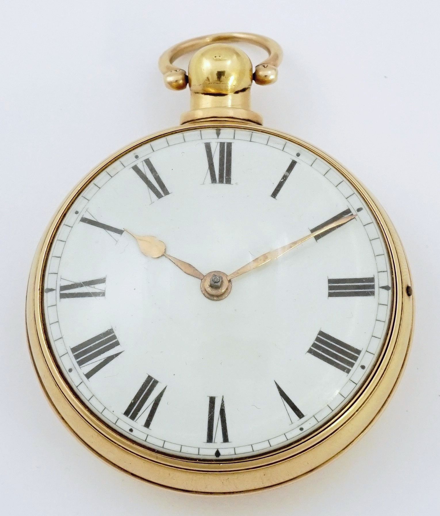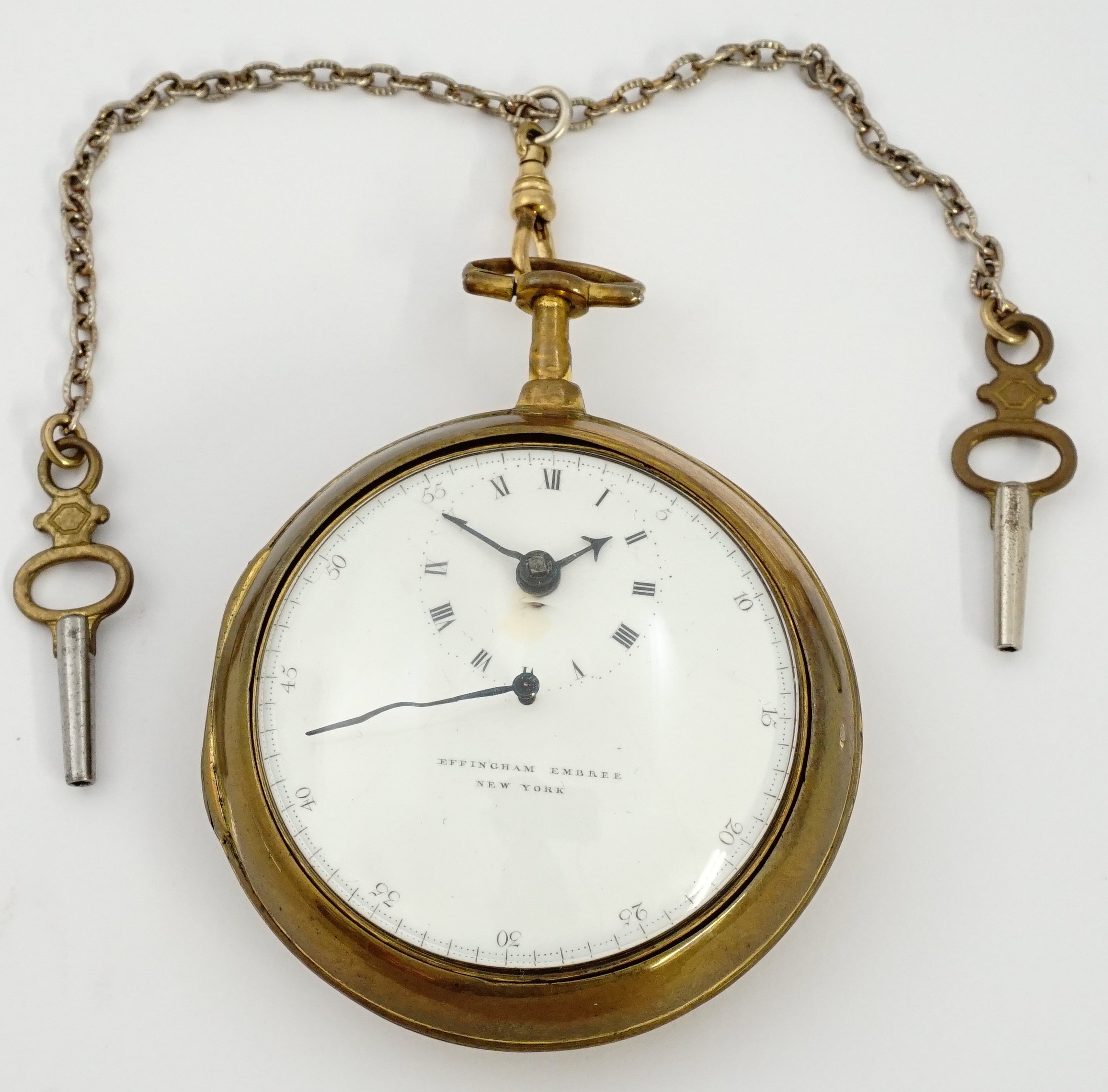 APW - Effingham Embree, New York, verge fusee doctor's watch with center-seconds and hacking feature, 58mm, gilt OF original pair cases, inner with casemaker's incuse "I B" marking, the outer containing paper for clock and watchmaker George Solliday of Montgomeryville, Pennsylvania, white enamel dial with upper timekeeping register, hacking slide outside dial at 8-seconds, center sweep-seconds with hand sharply arched for clearance above setting arbor, KWKS, verge escapement, diamond endstone, gilt mvt with pierced and foliate scrolled balance cock having a bird of prey at its neck, s#729 with nearby s#727 within inner case. Comes with a small chain with two keys attached. Effingham Embree was born in 1759 and was in business on his own in New York from 1789 to 1795 during which period the present watch was presumably made. After 1795 he relocated to Long Island and sold his New York business to Stephen Van Wyck. Selections from the collection of Tom McIntyre. Mr. McIntyre's website contains stories on many of the watches, and discussion of the present piece can be viewed at the following link: https://awco.org/awcoshow.php?artname=Effingham+Embree&artid=126&collid=117&cidx=5