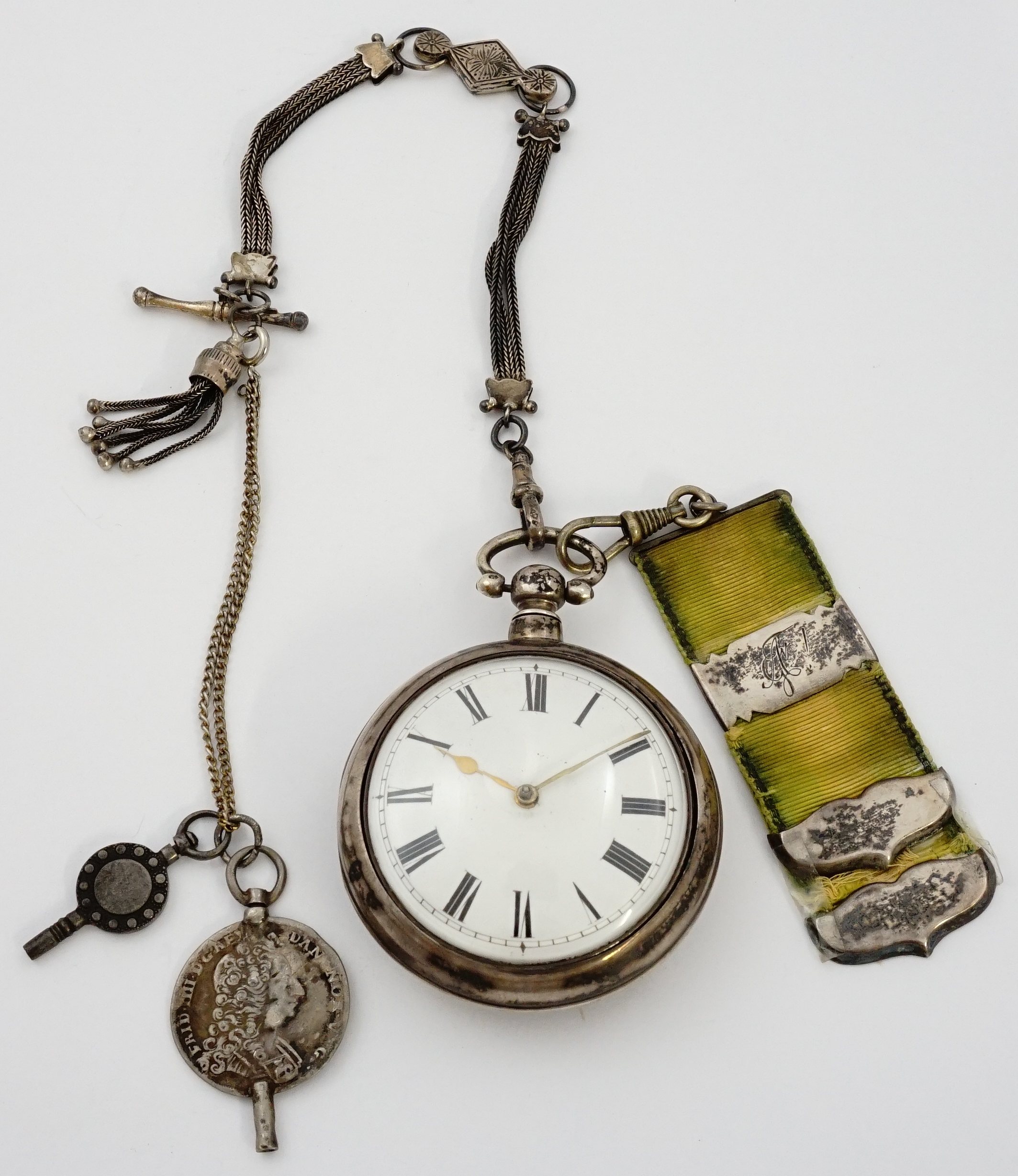 APW - Thomas Parker, Philadelphia, verge fusee, 56mm, silver OF pair cases, the inner bearing London hallmarks for 1763, casemaker's "I D" marking in cameo, the outer bearing London hallmarks for 1770 and containing a case paper for Caleb Baker of Bordentown, N.J., white enamel dial, KWKS, verge escapement, gilt mvt with pierced and foliate scrolled balance cock with grotesque mask at its neck, signed gilt locking dust-cap, s#86 with matching dust-cap serial number. Though this movement was presumably an English-made import, American signed movements of the true colonial era (pre-1783) are quite scarce. Watch is accompanied by silver and white metal chains as well as two keys including one made from a Danish coin dated 1716.