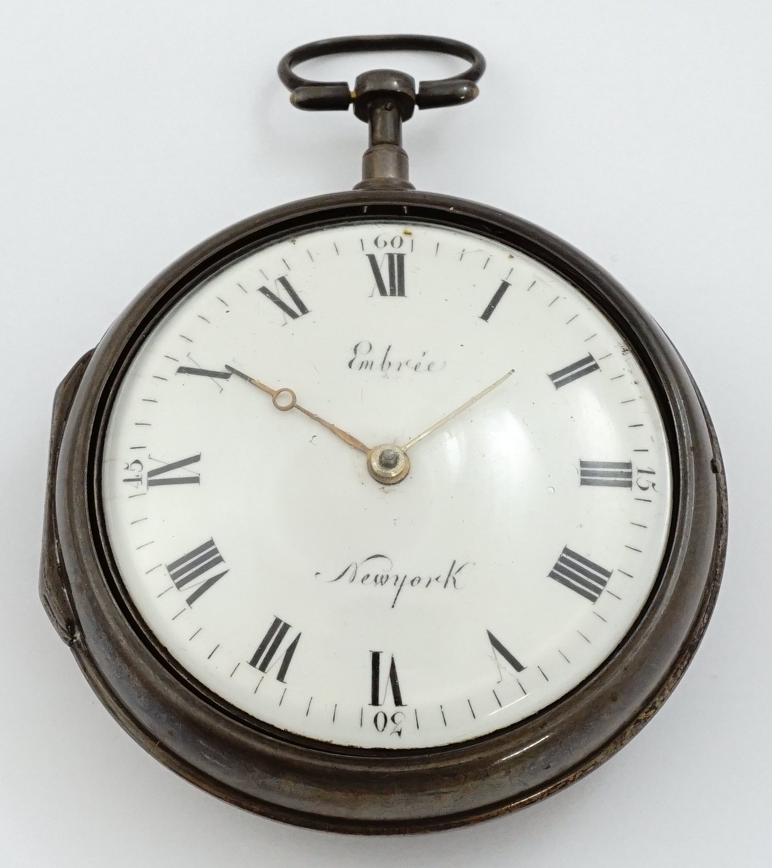 APW - Embrée, Newyork (sic), verge fusee, 56mm, silver OF original pair cases, inner marked with casemaker's incuse "I I P" marking, outer containing three papers for watchmakers Jos. Weiss, John Newhard and William Maus all of Pennsylvania, white enamel dial with script signature, KWKS, verge escapement, gilt mvt with pierced and foliate scrolled two-footed balance bridge, openwork plate mask over approximately 1/2 of mvt surface, s#10 visible to mvt dial plate and cases both with s#6510 having corresponding last two digits. This interesting early Federal era watch is of evident French origin and charmingly includes the accent mark in the signature as well as combines Newyork (sic) into a single word. Effingham Embree was born in 1759 and was in business on his own in New York from 1789 to 1795 after having been previously in business with Joseph Pearsall. After 1795 he relocated to Long Island and sold his New York business to Stephen Van Wyck. Selections from the collection of Tom McIntyre. Mr. McIntyre's website contains stories on many of the watches, and discussion of the present piece can be viewed at this link: https://awco.org/awcoshow.php?artname=Embr%C3%A9e+Newyork&artid=127&collid=117&cidx=4