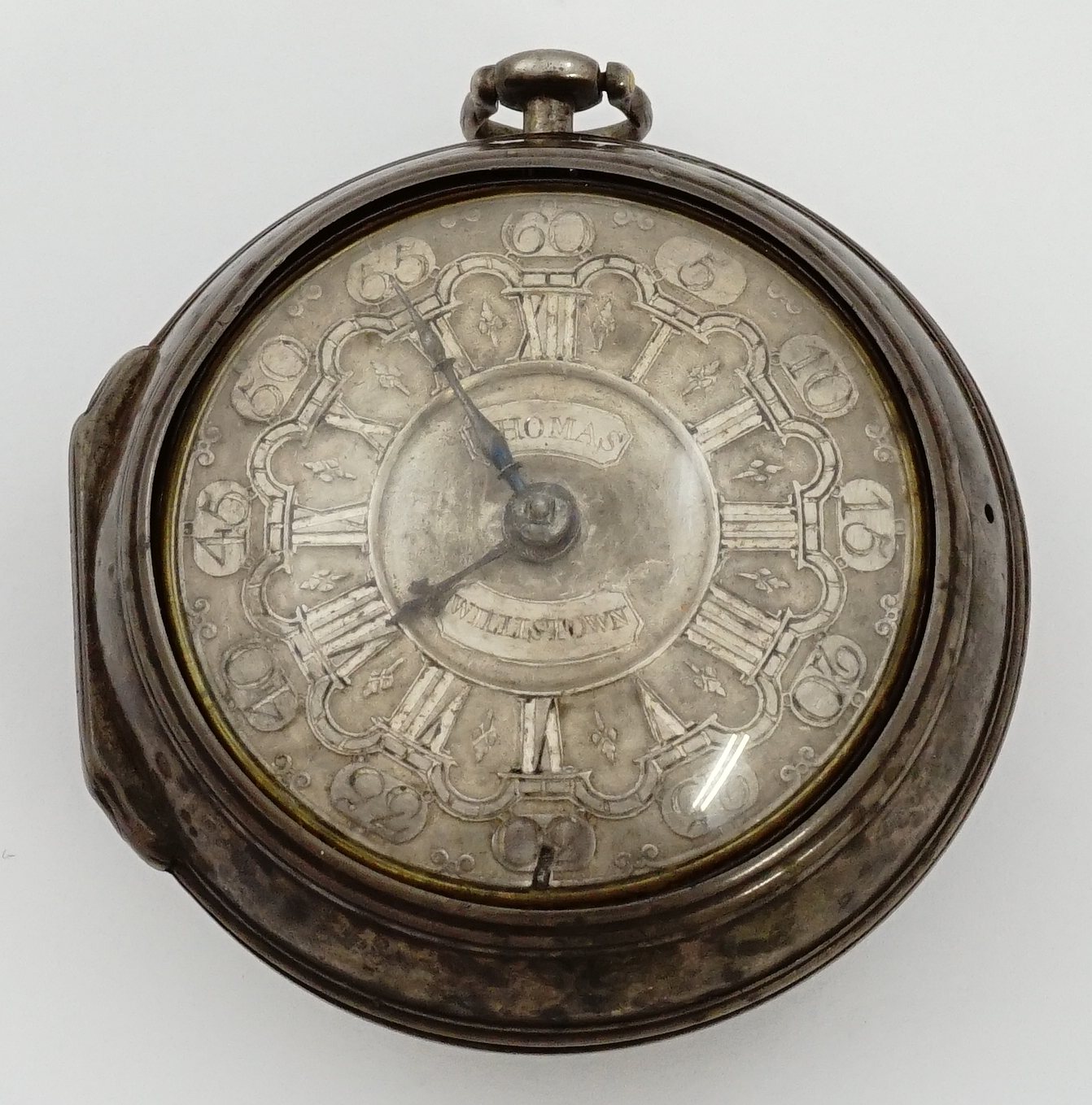 APW - Isaac Thomas, Willistown, Pennsylvania, verge fusee, 56mm, silver OF original pair cases bearing London hallmarks for 1764, "H . B" marking in cameo possibly for casemaker Henry Billinghurst, rear of inner case with scratched "ExR" initials and 1784 date, signed silver champléve dial, beetle and poker hands, KWKS, verge escapement, gilt mvt with pierced and foliate scrolled balance cock having bird of prey at its neck, s#4779 with matching serial number within inner case. Clockmaker Isaac Thomas of Willistown, Pennsylvania was born in 1721 and died in 1802. Though this movement was presumably an English-made import, American signed movements of the true colonial era (pre-1783) are quite scarce. Selections from the collection of Tom McIntyre. Mr. McIntyre's website contains stories on many of the watches, and discussion of the present piece can be viewed at this link: https://awco.org/awcoshow.php?artname=Isaac+Thomas&artid=125&collid=117&cidx=1