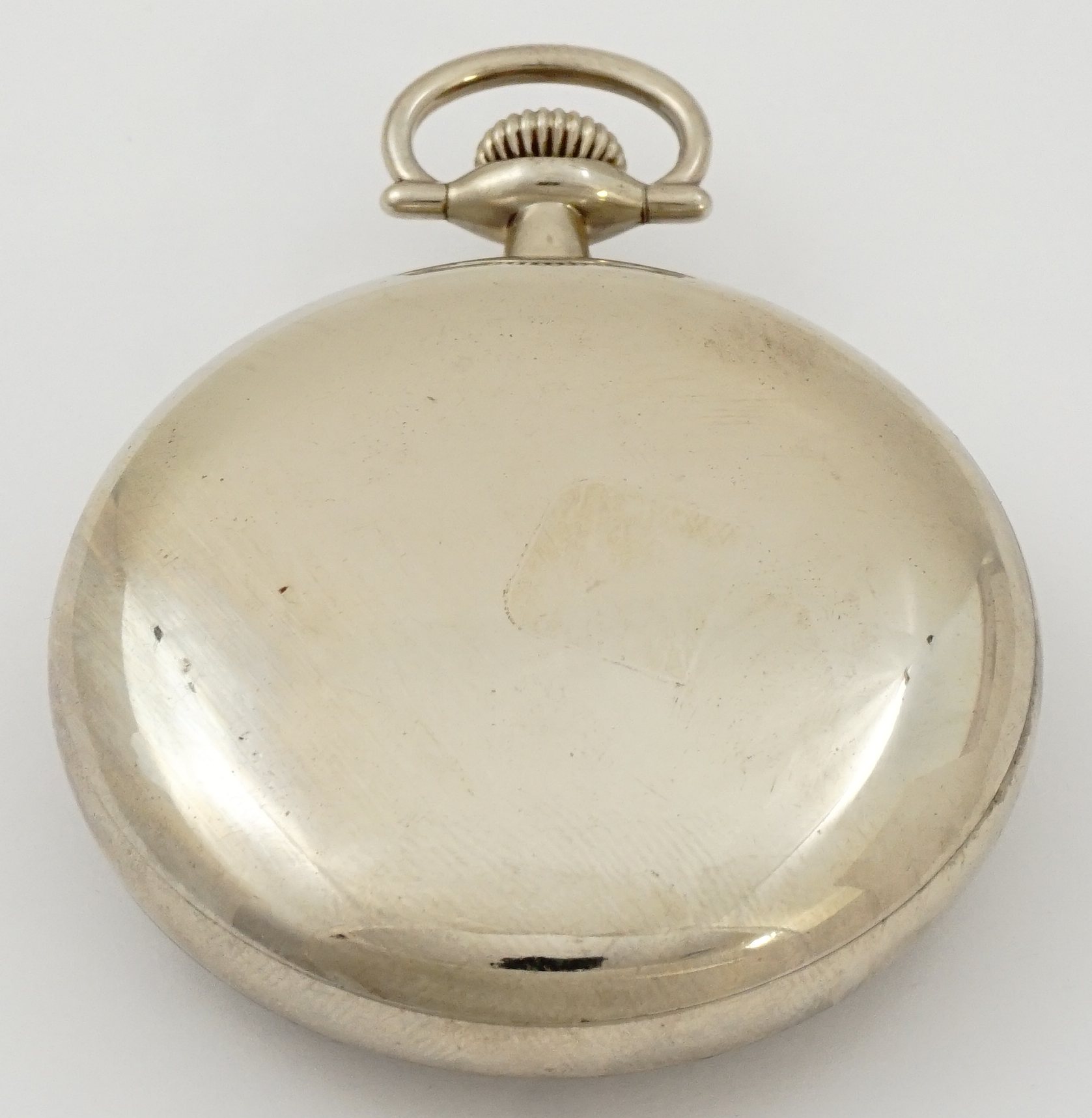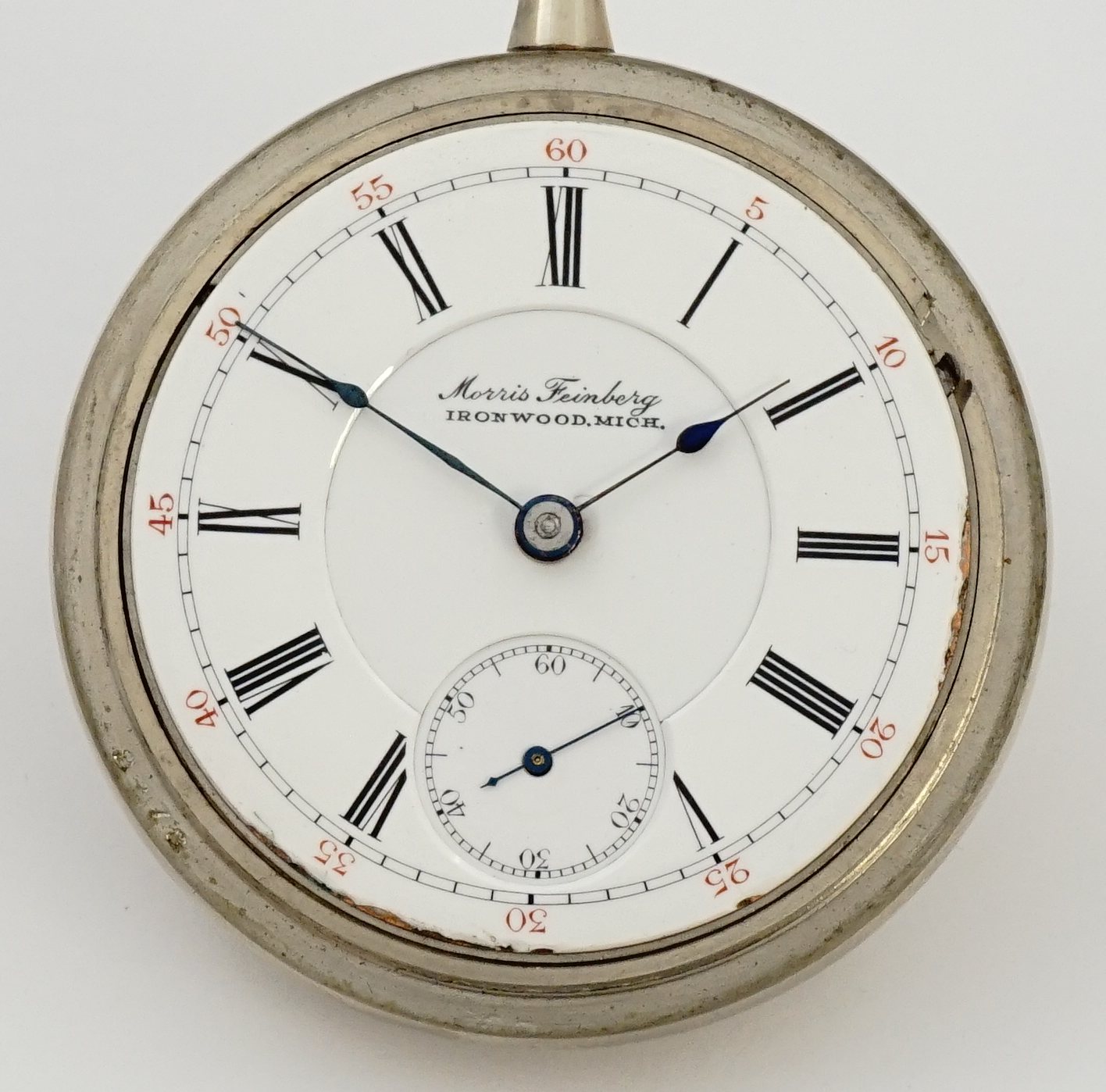 APW - Seth Thomas, "The Accurate Timer, Cosmopolitan Watch Co, USA" marked on two-tone mvt, 17J, 18S, base metal OF case, "Morris Feinberg Ironwood, Mich." signed white enamel DS dial, SW-LS, gilt mvt screws and regulator spring, two-tone gilt and nickel damascene, s#225459. A very attractive private label marking, and interestingly there were "Cosmopolitan Watch Co., The Accurate Timer" marked private label watches also made by Illinois, Hamilton, and Waltham. Some of these are marked with the Morris Feinberg name as the present example, some are marked with a Feinberg & Sloan partnership name, and some are marked only with the partner Raphael Sloan's name.