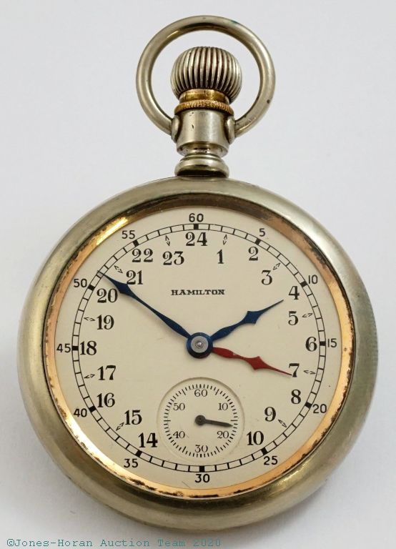 APW - Hamilton, Grade 974 with rare DeLong escapement, unusual 24 hour dial designed for one hour hand revolution per day, 17J, 16S, nickel OF swingout recase with "U.S. Shipping Board" marking to rear, metal dial, time-zone hour hands set 3 hours apart, SW-SS, DeLong escapement with D-shaped upright pallets extending downward below the plane of the lever, mono-metallic balance with Elinvar hairspring, nickel damascene, s#1248499. An intriguing piece, although the movement serial number ostensibly dates to about 1917 the mono-metallic balance wheel of the watch dates to the 1940s or somewhat thereafter and we suspect that the movement's other unusual features (24 hour dial and its associated gearing, and the DeLong escapement) also may have been executed at this time. Charles E. DeLong's escapement designs were granted U.S. patent numbers 1192812 and 1327226 on July 25, 1916 and January 6, 1920 respectively. The DeLong escapement was added to a small number of Hamilton, Illinois, and Ball Hamilton movements and these watches initially performed admirably with functional advantages of an increased escapement draw angle and a reduced recoil, but the DeLong escapement never gained widespread use as its benefits were offset by a potential for performance impairment following servicing due to this escapement's greater sensitivity to slight changes in the depthing of the escapement hole jewels. From the well-known Hamilton collection of Robert Bennett of Olivehurst, California.