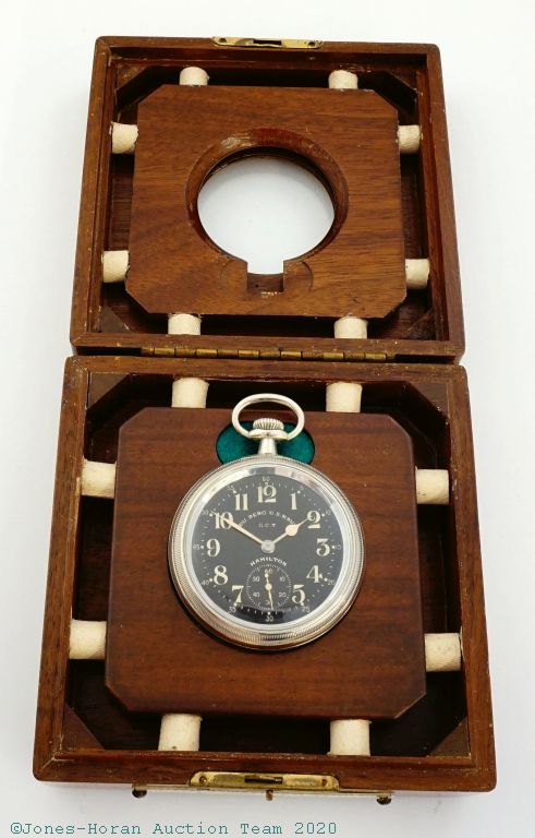 APW - Hamilton, Grade 992 Elinvar, rare Bu. Aero U.S. Navy "Aircraft Navigational Watch," 21J, 16S, chrome-plated base metal OF case with contract markings to rear, black metal dial signed "Bu. Aero U.S. Navy, G.C.T., Hamilton," SW-LS, fully capped lever escapement, mono-metallic balance with blued Elinvar hairspring, wide striped pattern nickel damascene, s#2625421. Comes with a fitted wooden box bearing front plaque with Bu. Aero U.S. Navy marking. A rare late 1930s military timepiece; a total of 300 of these Grade 992 Elinvar "Aircraft Navigational Watches" were made, and these were supplied by Hamilton to the U.S. Navy Bureau of Aeronautics during the years 1937 and 1938. From the well-known Hamilton collection of Robert Bennett of Olivehurst, California.