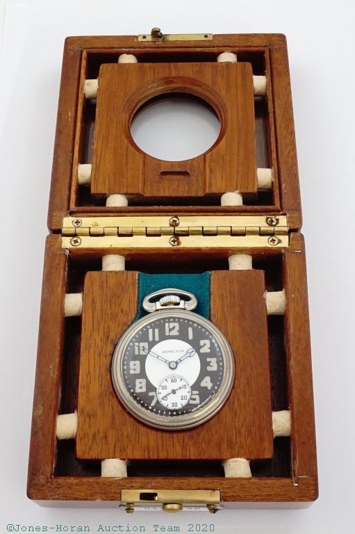 APW - Hamilton, Grade 992B with "U.S. Army" marked mvt and very unusual dial, 21J, 16S, .800 silver OF case, enamel DS dial with white center section and seconds-register, black outer chapter, SW-LS, fully capped lever escapement, mono-metallic balance with Elinvar hairspring, striped pattern nickel damascene, s#C8343. This particular movement serial number is listed in the Hamilton ledger as having been sold on April 29th, 1941. Comes with a fitted wooden box with Hamilton signature plaque to its front. From the well-known Hamilton collection of Robert Bennett of Olivehurst, California.