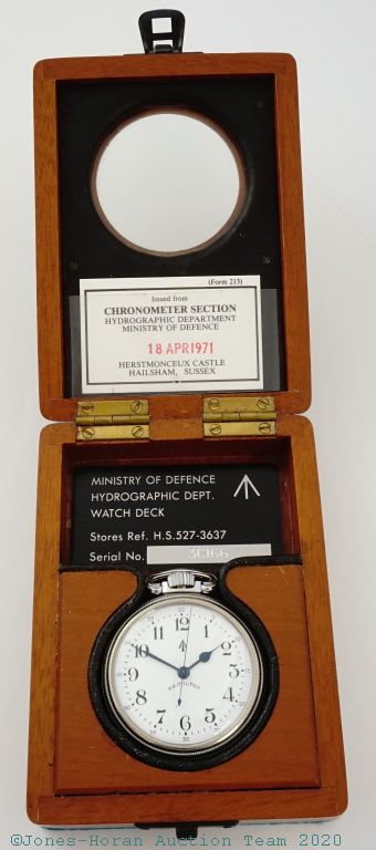 APW - Hamilton, Grade 3992B, 22J, World War II era Navigation Master Watch made for British military use, 16S, chrome-plated base metal OF case with Ministry of Defence (English spelling) pheon (broad arrow) to rear as well as Hydrographic Services (HS3) contract markings which have been lightly overscored, previous light numerical marking evident at center covered by current marking, white enamel dial with pheon and Hamilton marking, SW-hack-set with sweep-seconds, fully capped lever escapement, mono-metallic balance with Elinvar hairspring, mvt marked "U.S. Navy Bu. Ships" as well as with British pheon, striped pattern nickel damascene, mvt s#3C166. Watch comes with a fitted wooden box with internal Ministry of Defence signature plaque and 1971 dated Hydrographic Department card. From the well-known Hamilton collection of Robert Bennett of Olivehurst, California.