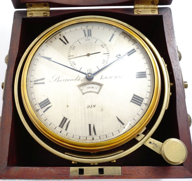 Barraud's, London, marine chronometer with 8-day winding indicator aperture, mounted within gimbaled brass tub with integrated winding key set in a three-tier brass bound mahogany box, brass drop handles, silvered dial of approximately 5 inch diameter signed "Barraud's London, No 918," KWKS, free-sprung with spring detent escapement, bi-metallic compensation balance with blued steel helical hairspring, s#918.