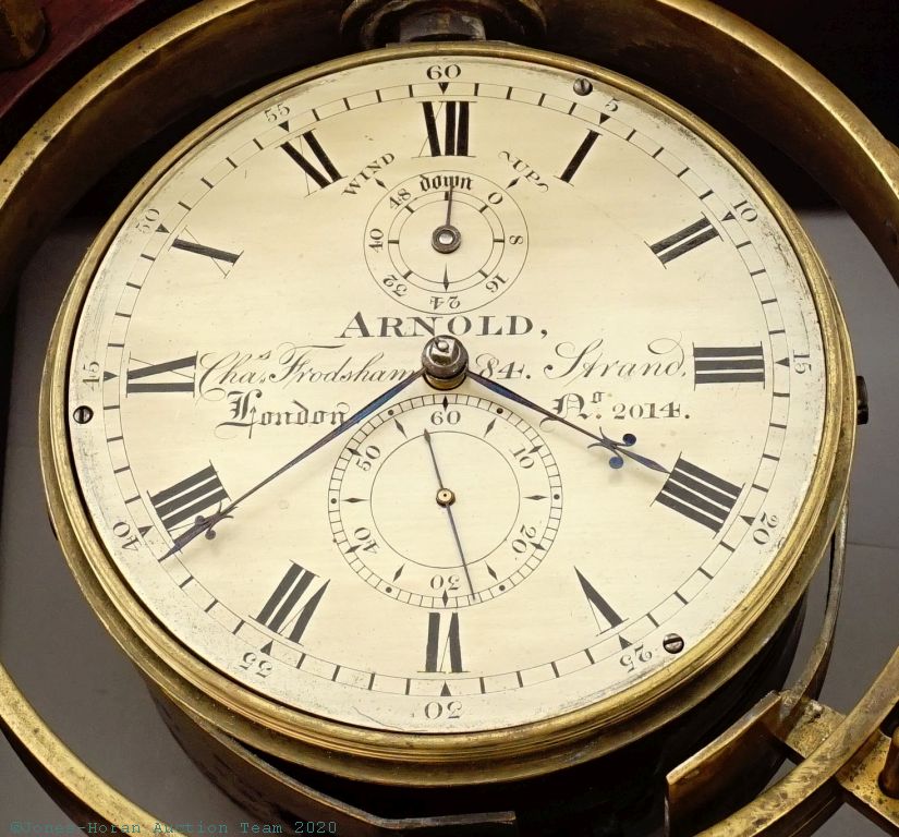 Arnold, Charles Frodsham, 84 Strand, London, marine chronometer with 48-hour winding indicator, mounted in a spring loaded brass tub to allow vertical movement, unmarked three tier mahogany outer box with brass drop handles, silvered dial of approximately 3.5 inch diameter signed "Arnold, Chas Frodsham, 84. Strand, London, No 2014," KWKS, fusee-drive with spring detent escapement, free-sprung bi-metallic compensation balance with blued steel helical hairspring, s#2014 with matching number scratched into tub.