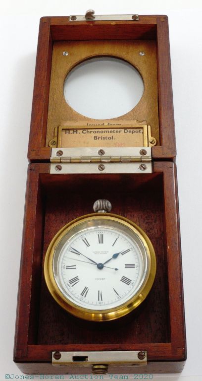 EPW - Ulysse Nardin, Locle, British military lever escapement chronometer deck watch with box, 56mm, silver OF original Nardin case with "H.S.2" marking to rear with British military pheon (broad arrow), white enamel dial, SW-button-set, lever escapement with capped escape wheel, 19-20J, expansion balance is probably compound (Guillaume Invar) style, blued hairspring, gilt mvt, s#122287 with matching serial number to dial. Comes in wooden box with brass insert to hold watch and with a small card in the upper lid marked "Issued from H.M. Chronometer Depot, Bristol." that also has a lightly visible 1943 date stamping in ink at bottom. The "H.S.2" case marking is for Hydrographic Services Class 2 rating, designating a chronometer watch adjusted for isochronism in at least five positions, with only the "H.S.1" designation for chronometer with detent escapement being of higher ranking.