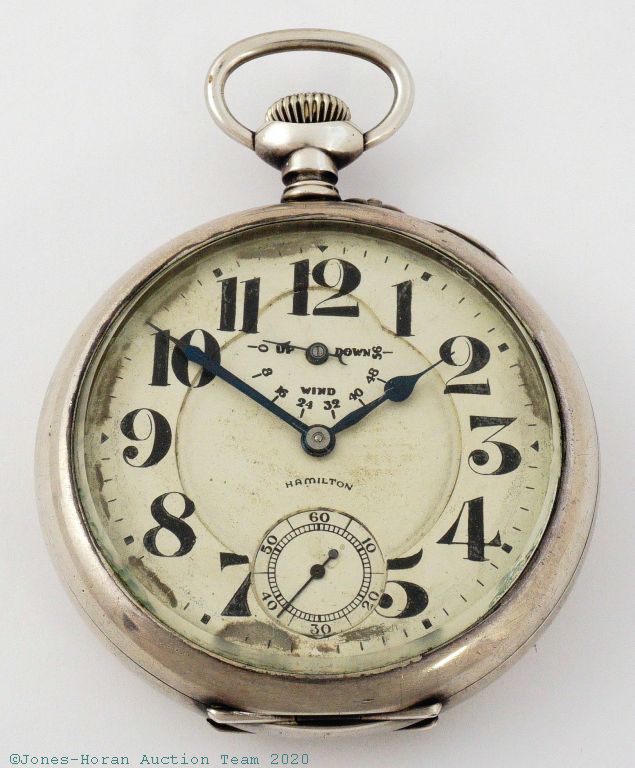 APW - Hamilton, "Torpedo Boat Watch" with 56-hour winding indicator, 21J, 36S, massive 69mm sterling silver OF original C.W.C.Co. case, silvered DS dial, SW-pin-set, fully capped lever escapement, striped pattern nickel damascene, s#1260137. Gross weight of assembled watch 179.9 dwt (279.6 g). Hamilton's total production of this 36 size movement was 970 made with all examples being produced in a single production run spanning serial numbers 1260001 to 1260970. From known examples it appears that the first 500 movements of this run were typically paired with massive sterling silver Crescent Watch Case Co. cases as seen with the present example, while the final 470 movements of the run were typically arranged in boxed chronometer style being in gimbaled chrome tubs inside mahogany boxes.