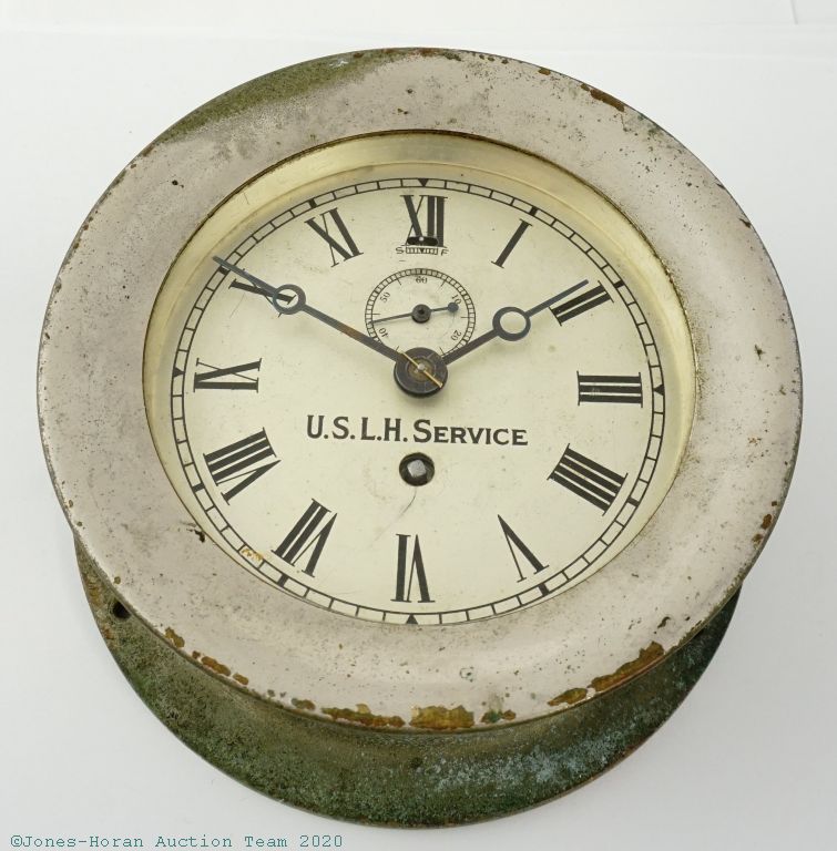 Clock - Chelsea, U.S. Lighthouse Service clock, approximately 5.5 inches round x 2.5 inches deep, nickel-plated brass case, "U.S.L.H. Service" marked dial with small "Chelsea-Boston" marking at bottom, KW, platform lever escapement, s#198742 to mvt, s#198552 to case. Comes with a Chelsea certificate of origin noting this movement serial number's June 29th, 1931 sale to the Superintendent Lighthouse. Comes also with a Certificate of Origin from Chelsea Clock, a winding key, and a recent servicing invoice. We believe the close, but not quite matching, movement and case serial numbers of this example are likely indicative of a depot level rebuild in a military or government facility and are not unusual among this type of clock.