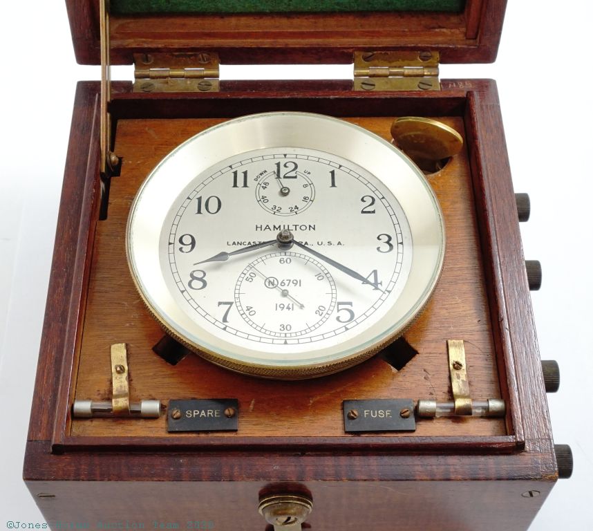 Hamilton, Model 21 Break Circuit marine chronometer, fusee-drive with spring detent escapement, 56-hour power reserve winding indicator, original brass tub within original non-gimballed fitted mahogany box with Bakelite knobs on the side for input power and signal out, inner box with wiring and two fuses (one being a spare), gilt Hamilton signature plate on top lid, silvered dial of approximately 4 inch diameter, marked "N, 6791 and 1941" within seconds-register, KWKS, fully capped spring detent escapement with break circuit attachment, 14J, mono-metallic free-sprung balance with helical Elinvar hairspring, striped pattern nickel damascene, s#2E6791. This particular chronometer was used by the Woods Hole Oceanographic Institute for depth charge research and wave frequency research. This particular chronometer also comes with the original timing card dated April-May as well as various other correspondence and provenance. From the estate of Daniel L. Haff.