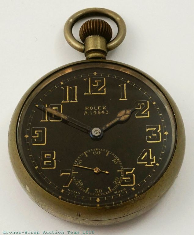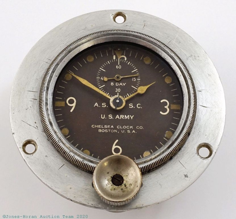 Chelsea 8-day, World War 1 era aluminum aircraft clock for the Aviation Section, Signal Corps, a predecessor to the modern day US Air Force, 107mm round, 46mm thick, original aluminum case with three mounting holes, screw down bezel and winding/setting crown at 6, back stamped "C.C.Co 117, February 1918," original black dial has turned an attractive "tropical" brown color with a 3-6-9 layout with subsidiary seconds at 12, matching s#116080 on both movement and case. The Aviation Section of the Signal Corps was founded in 1914 and was the second iteration of the United States version of an Air Force. They first saw action against Pancho Villa during the Mexican Expedition when Villa attacked Columbus, New Mexico. The entire squadron consisted of 8 Curtis JN-4 "Jenny's" at the time and only 11 pilots. With the entire Aviation section only consisting of 44 active duty officers, this was soon to change with the breakout of World War 1 with the inevitable expansion that ended 33 years later in the formation of the United States Air Force. Truly a must have piece for the early military collector or the Chelsea collector who just doesn't have "everything." From the estate of Daniel L. Haff.