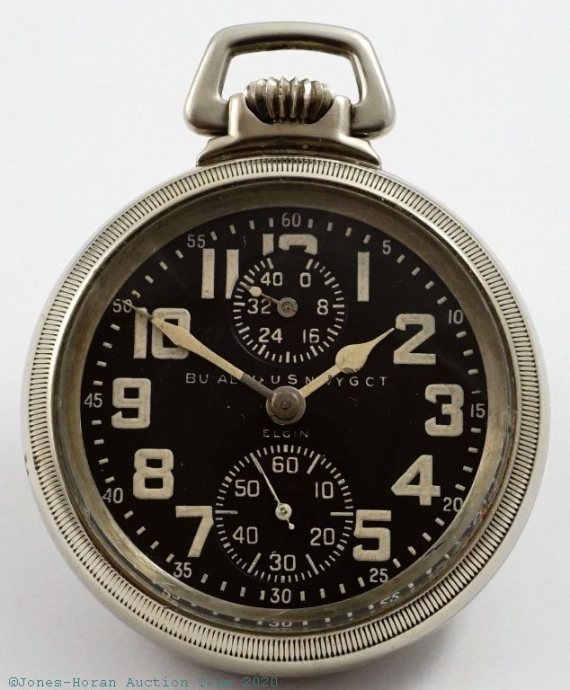 APW - Elgin, B.W. Raymond with winding indicator, "BU. Aero. U.S. Navy" marked mvt and dial, Grade 494, 23J, 16S, heavy nickel OF original case, "BU. Aero. U.S. Navy G.C.T Elgin" marked black metal DS dial, SW-LS, fully capped lever escapement, jeweled barrel arbor, gold jewel settings, gold center wheel, striped pattern nickel damascene, s#34682626. Gross weight of assembled watch 89.3 dwt (138.9 g). A rare 1930s military timepiece, the total production of the Grade 494 was 5000 made but only a tiny fraction of this number were made and marked for military use.