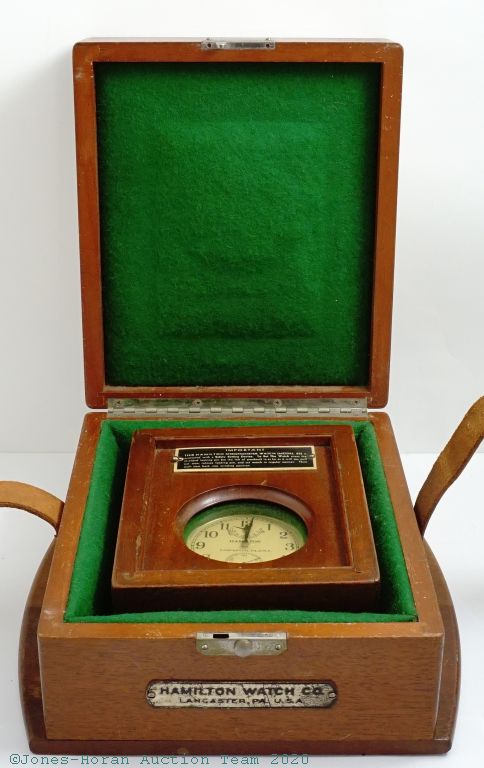 Hamilton, Model 22 lever escapement chronometer deck watch with winding indicator, 21J, 35S, chrome-plated base metal OF original case with screw back, inner snap cuvette, silvered dial with winding indicator at 12, SW-SS with safety pin to release setting (depress pin in order to pull out stem), fully capped lever escapement, mono-metallic balance with Elinvar hairspring, "U.S. Navy - Bu. Ships - 1943" marked mvt, striped pattern nickel damascene, s#2F27429. Watch comes with its inner fitted wooden box with plaque explaining the safety setting procedure and paper label describing ideal timing positions as well as with its outer wooden transportation box with Hamilton plaque and with leather strap and buckle. Also includes a service bulletin issued by the Hamilton Watch Company.