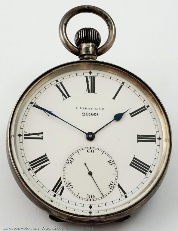 EPW - L. Leroy & Cie, Paris, "Marine Service Hydrographique" deck watch made for French Navy, 65mm, silver OF original case marked "Marine Service Hydrographique 20989" to its rear, signed silver cuvette, white enamel SS dial, SW-SS, lever escapement with capped escape wheel, 17J, gilt mvt, s#20989 with matching serial number within case and to dial. An impressive original example, L. Leroy & Cie deck watches are rare and this is the first example we have handled.
