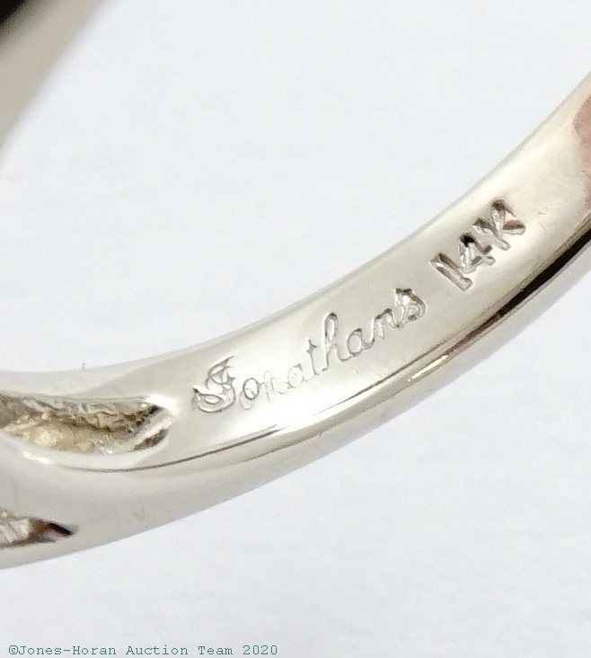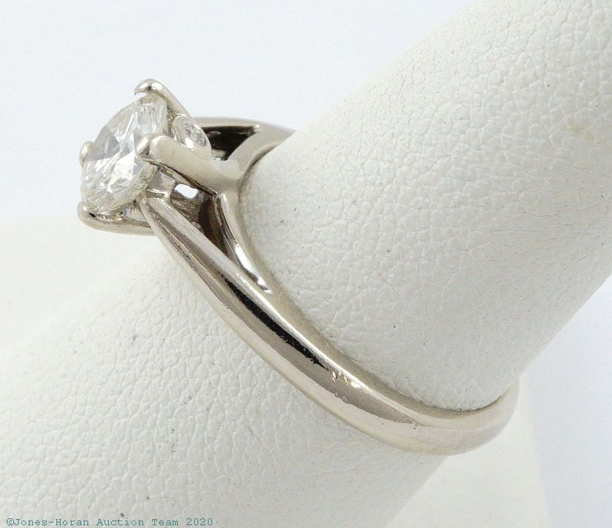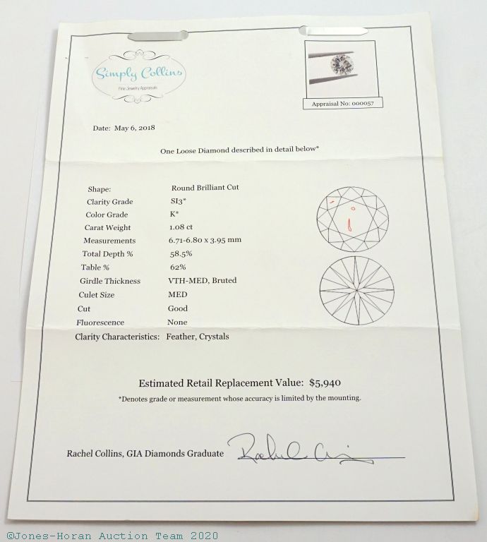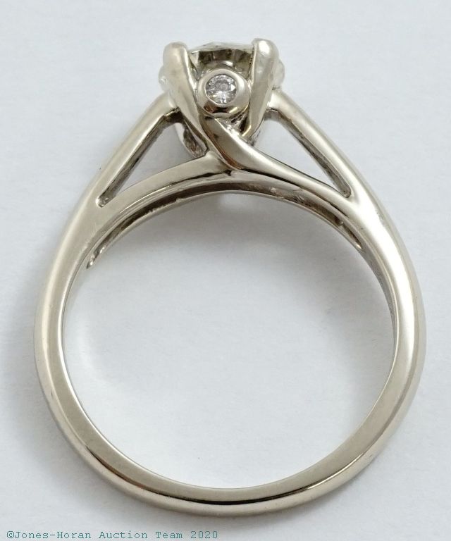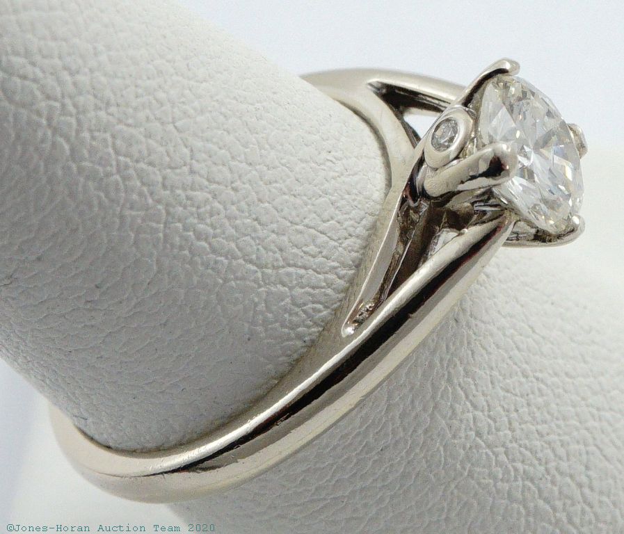 Diamond and 14K white gold engagement ring, round brilliant cut diamond weighs 1.08 ct, very clean diamond except for a feather in the middle of the table, two round brilliant cut diamonds set on the side of the mounting weigh approximately 0.02 ctw, size 6.5. Includes a grading report from a GIA Diamond's graduate with an estimated value of $5,940 as well as an estimated K color and SI3 clarity. Gross weight 2.4 dwt (3.8 g).