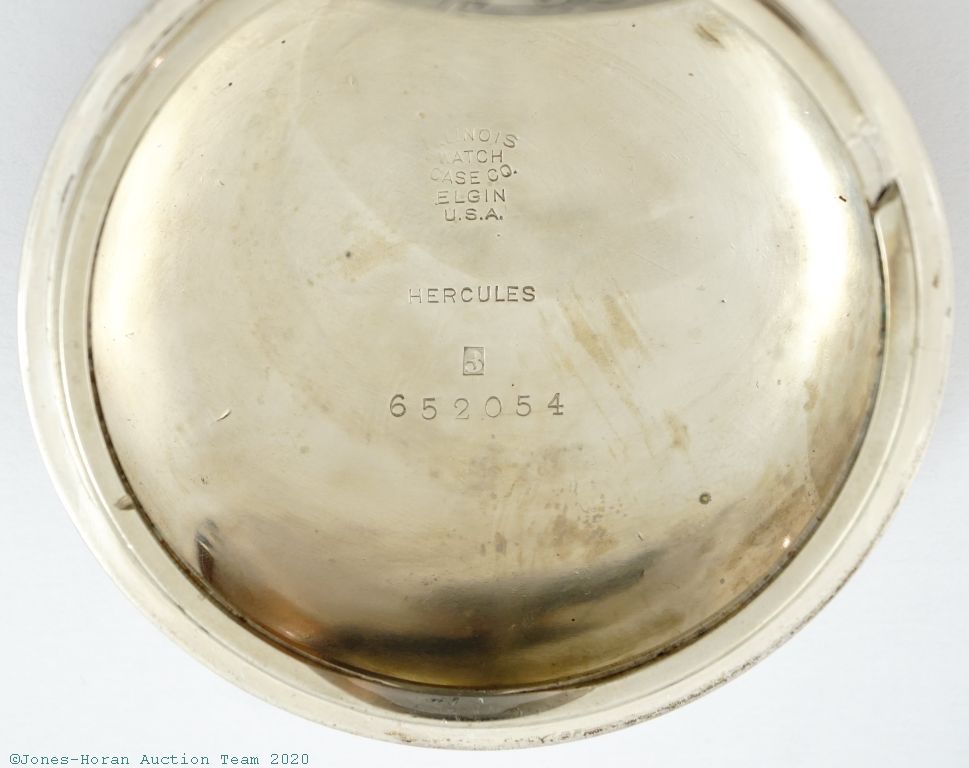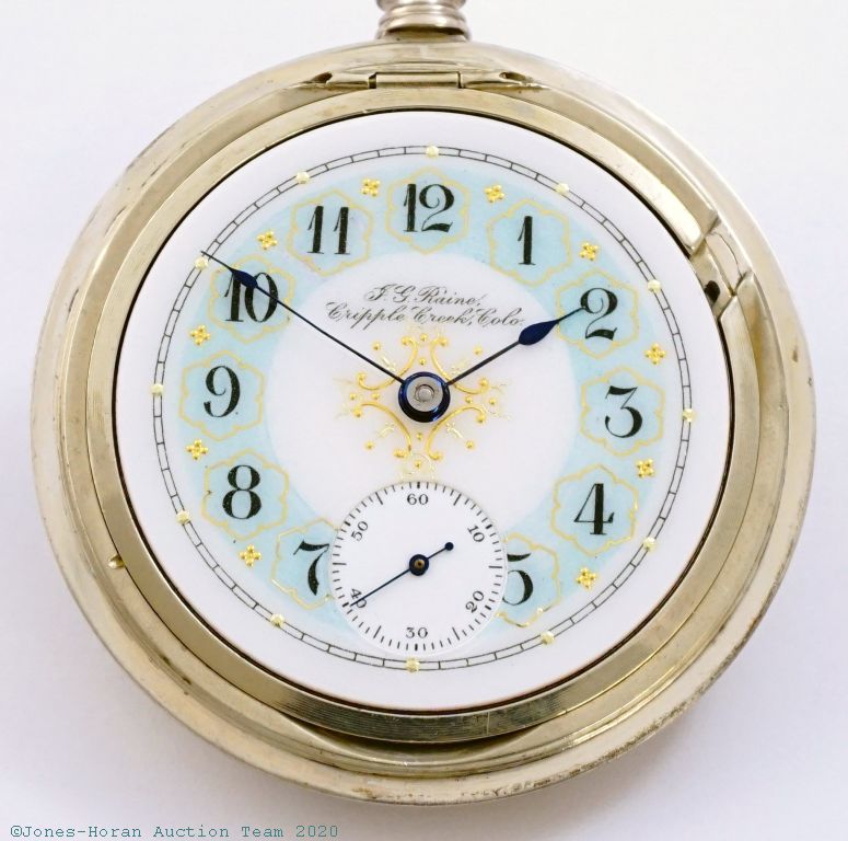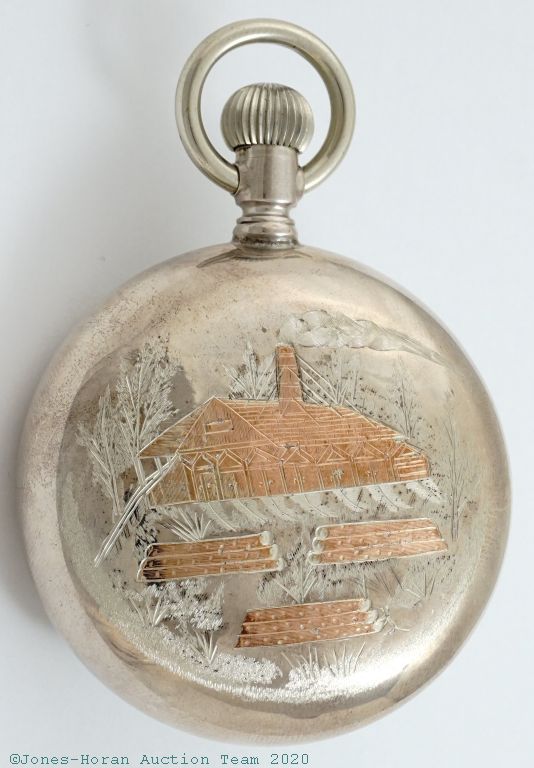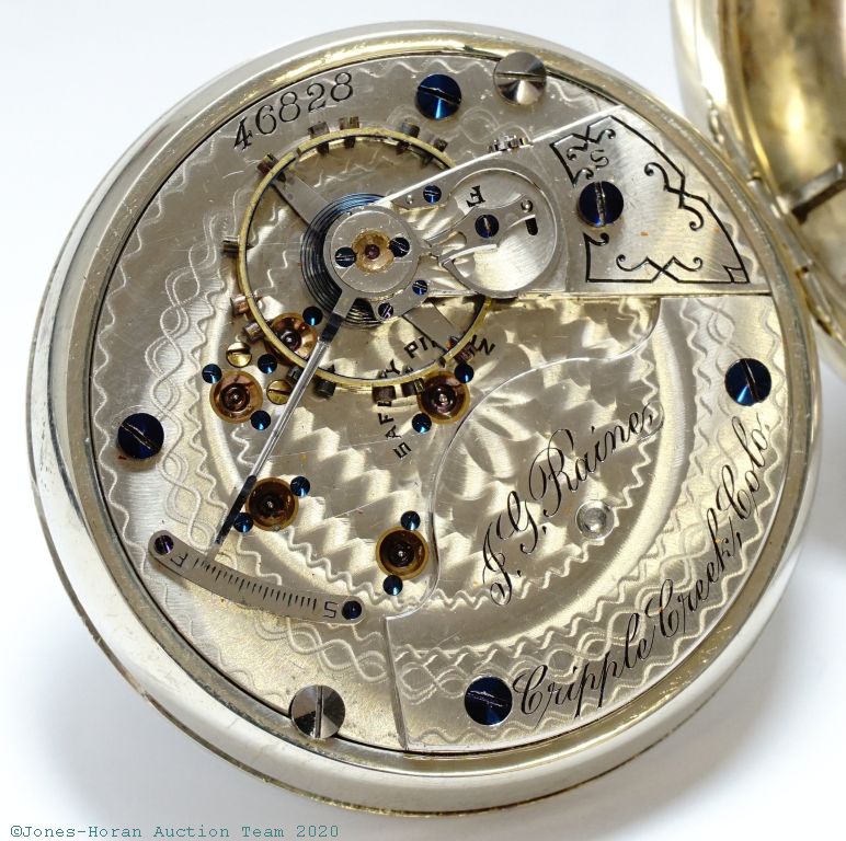 APW - Hamilton, "J.G. Raine, Cripple Creek, Colo" marked mvt and dial, Grade 930, 16J, 18S, silver-filled (silver exterior over a nickel core) Hercules swingout case with gold inlaid logging scene/sawmill to rear, fancy white and green SS enamel dial with gold foil decorations in two tones, SW-LS, nickel damascene, s#46828. J.G. Raine was a jeweler and optician with a shop at 209 Bennett Ave in Cripple Creek, Colorado. From the well-known Hamilton collection of Robert Bennett of Olivehurst, California.