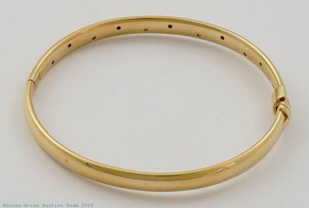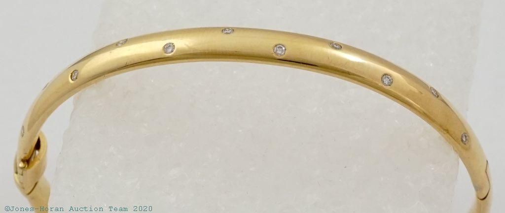 Diamond and 18K yellow gold bangle bracelet with fold over safety clasp, 11 round brilliant cut diamonds weigh approximately 0.11 ctw, bangle inside dimensions 60mm x 53mm, bangle outside dimensions 67mm x 58mm. A wonderfully heavy bangle bracelet made of solid materials giving it a very weighty feel, includes a yellow travel pouch. Gross weight of bracelet 22.9 dwt (35.7 g).