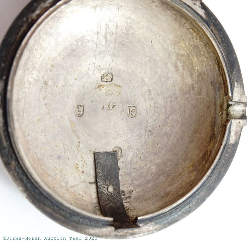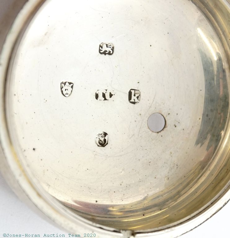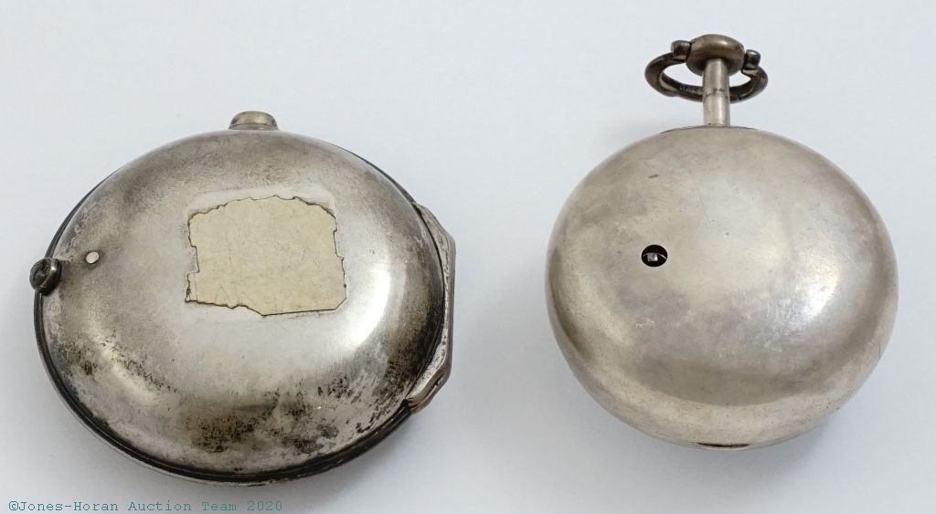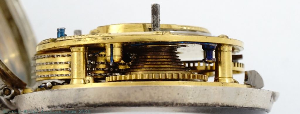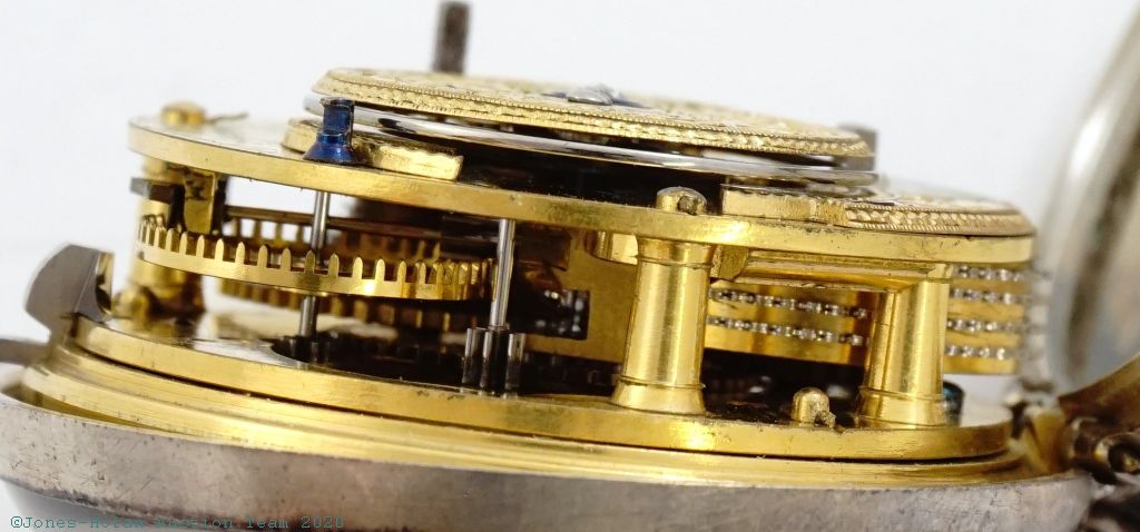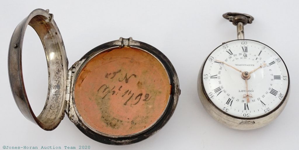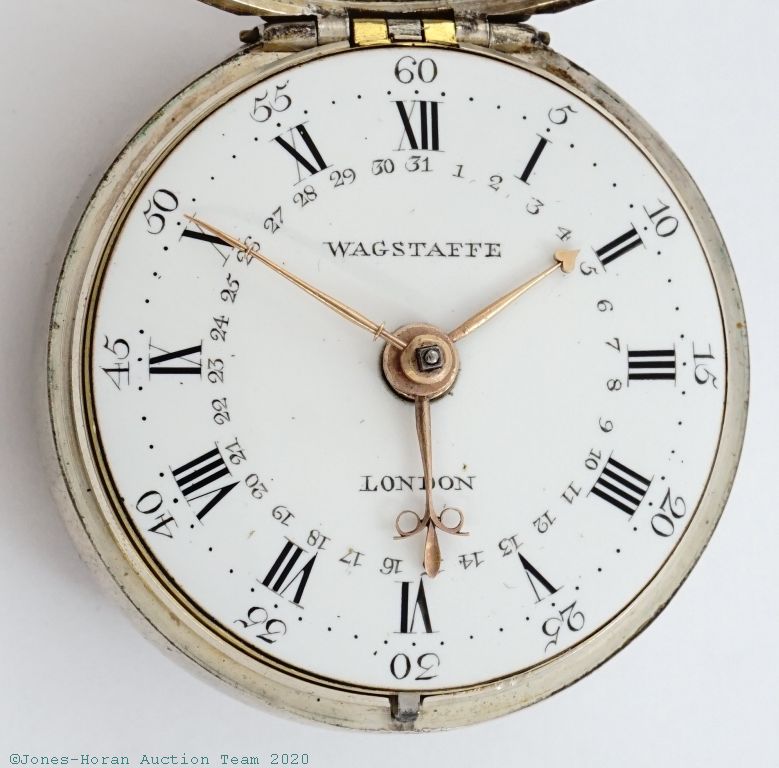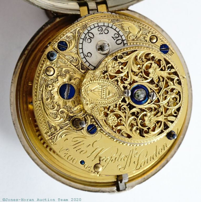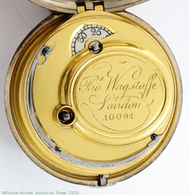 EPW - Thomas Wagstaffe, London, verge fusee with calendar, 54mm, silver OF original pair cases bearing London hallmarks for 1785, casemaker's "T C" marking in cameo, "Wagstaffe London" marked white enamel dial, gold hands, hour and minute are beetle and poker style, KWKS, verge escapement, diamond endstone, gilt mvt with pierced and ornately engraved foliate scrolled balance cock with urn at its neck, signed gilt locking dust-cap, s#10091 with matching serial number to dust-cap. From the collection of Robert L. Ravel, M.D.