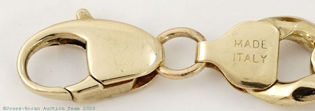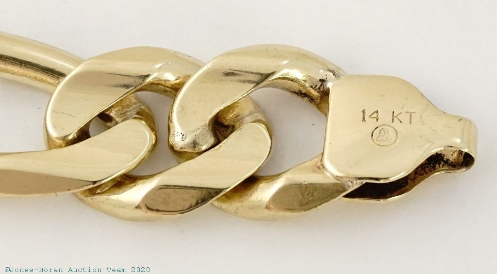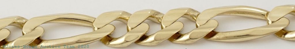 14K yellow gold "Monster" Figaro chain with 13mm wide links and lobster claw clasp, chain measures 21 inches long, a truly heavy and well made chain that will bring joy to whoever wears it. Gross weight 86.2 dwt (134.1 g).