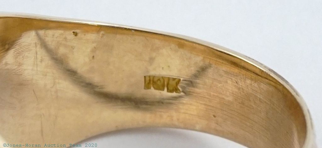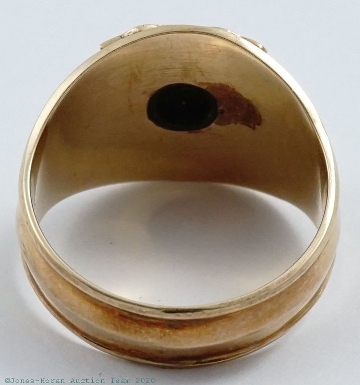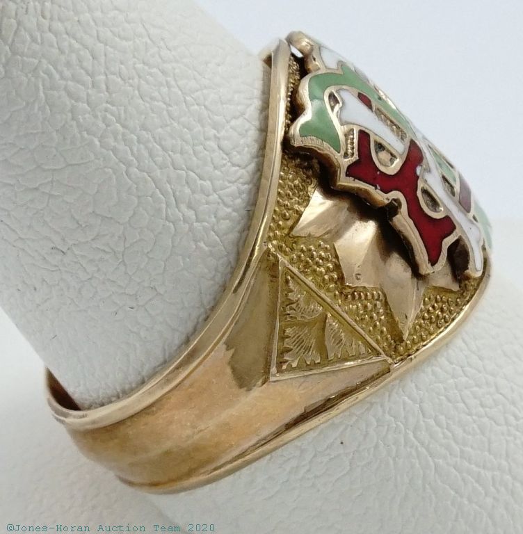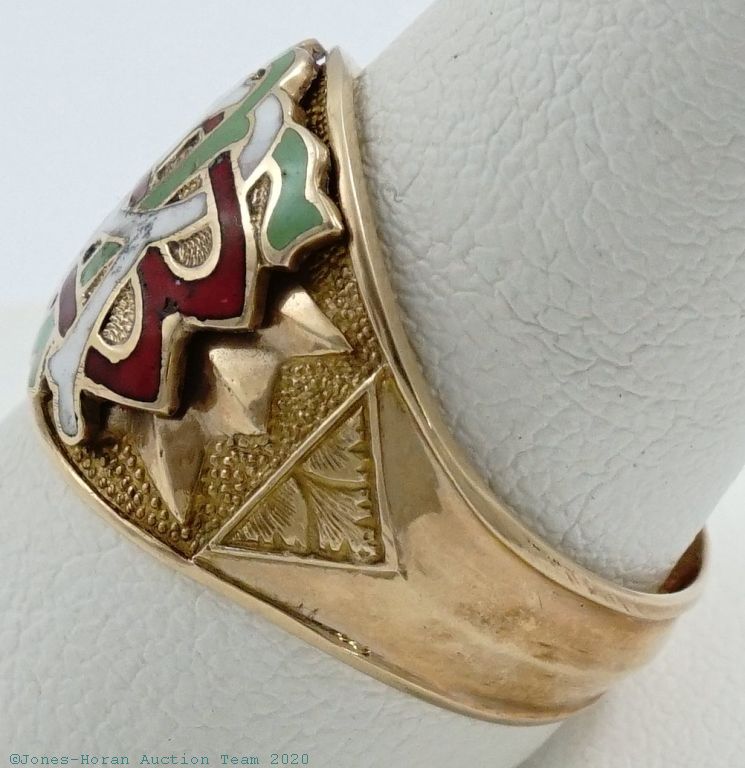 Brotherhood of Railroad Trainmen signet ring in 10K gold, green, white and red enamel letters with sunburst and floral pattern, size 9.5, truly a must have for the railroad watch collector, especially for those interested in Brotherhood signed watches. Gross weight 4.7 dwt (7.4 g).