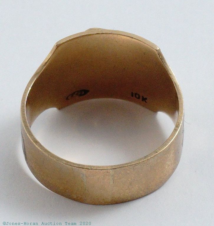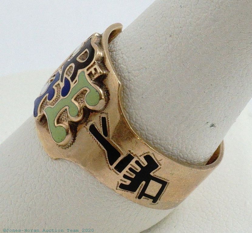 Brotherhood of Locomotive Fireman & Engineers (B of LF&E) signet ring in 10K gold with multicolor black, white, red, green and blue enamel accents, size 9.25, truly a must have for the railroad watch collector especially for those interested in Brotherhood signed watches. Gross weight 4.5 dwt (6.9 g).