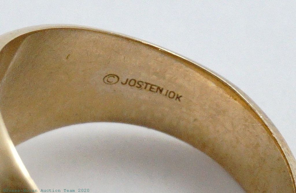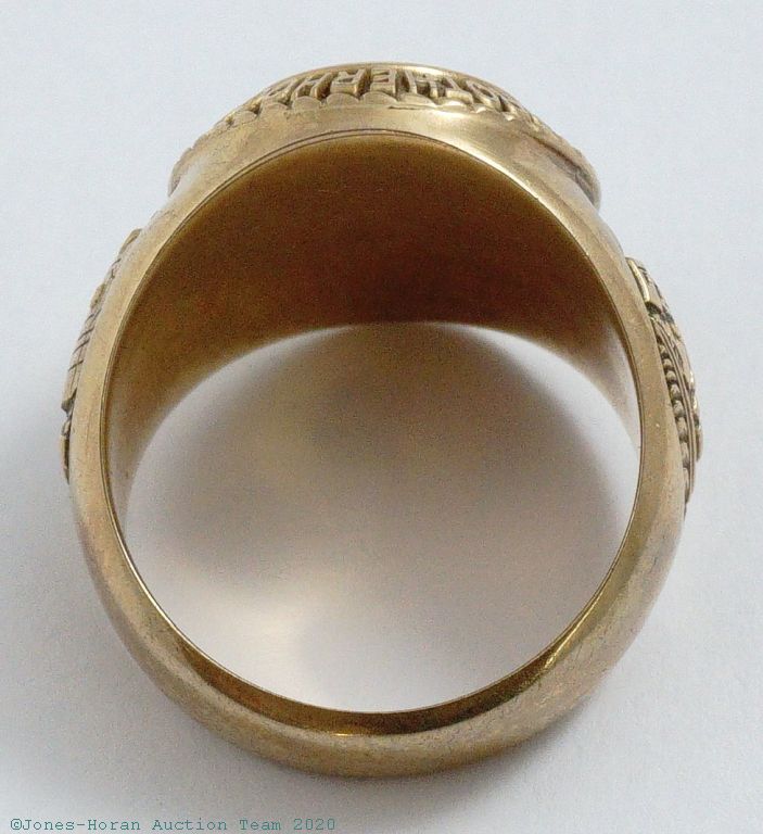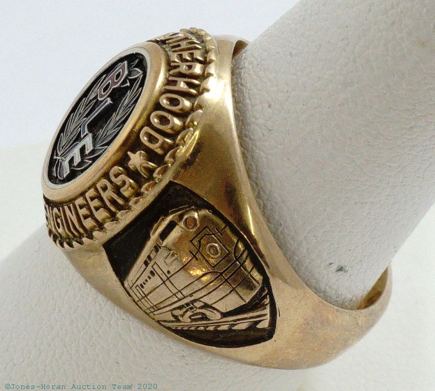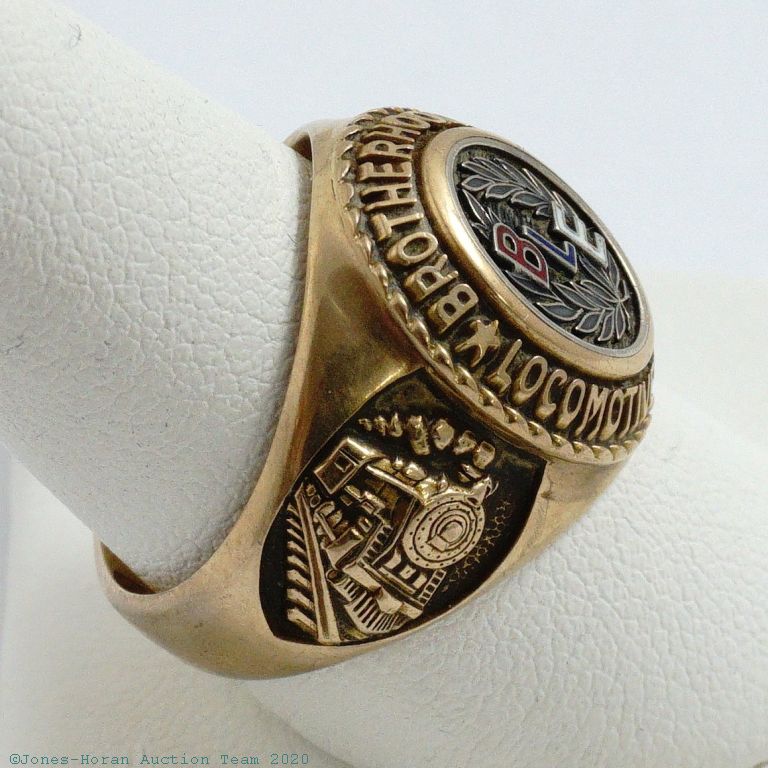 Brotherhood of Locomotive Engineers (B of LE) signet ring in 10K yellow gold with red, blue and white enamel set within a wreath, embossed diesel electric locomotive on one side and steam locomotive on the opposite side, size 8.5, truly a must have for the railroad watch collector especially for those interested in Brotherhood signed watches. Gross weight 8.5 dwt (13.2 g).