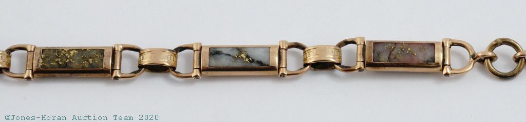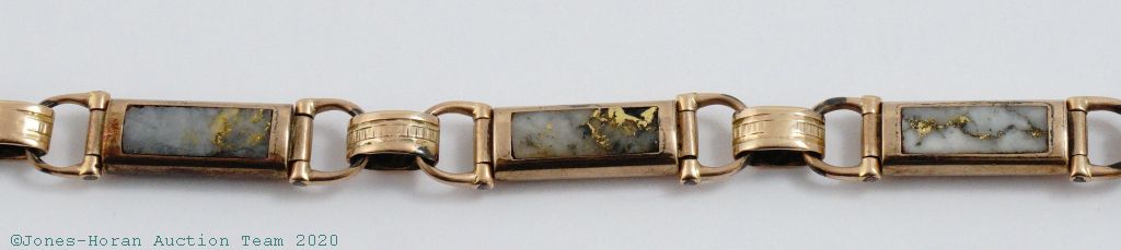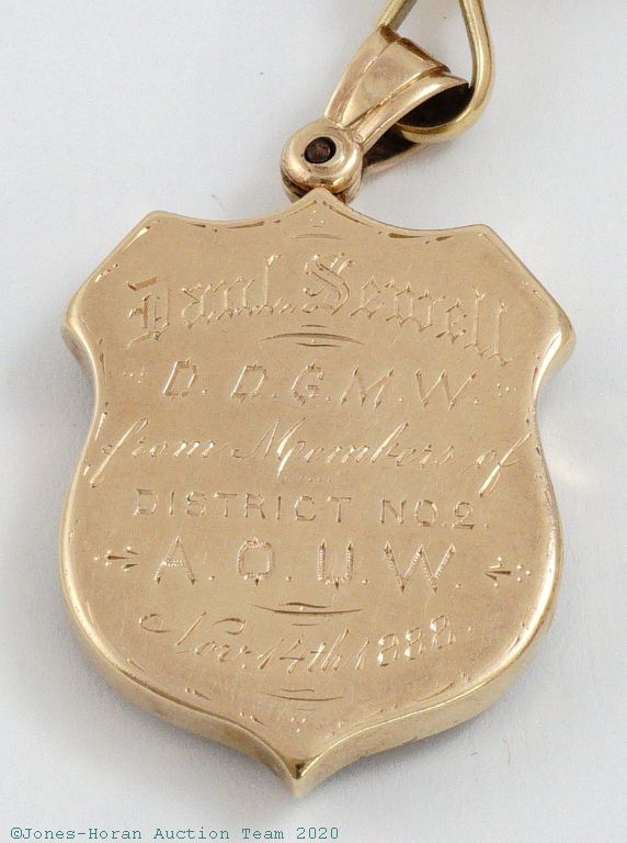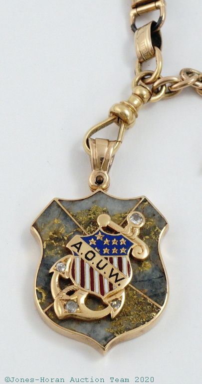 Victorian 14K gold and quartz watch chain with T-bar and matching fob, shield fob with applied gold anchor set with 4 mine cut diamonds and accented with red, white and blue enamel, presentation by the Ancient Order of United Workmen, individual articulating links, chain measures 15 inches from T-bar to clasp. A wonderful heavy chain perfect for that special watch. Gross weight 36.0 dwt (56.0 g).