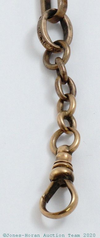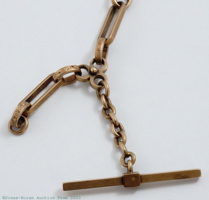 10K gold Victorian watch chain with fancy connecting links as well as a T-bar and fob chain, chain measures 13.5 inches from T-bar to clasp. A fine chain to match that special pocket watch. Gross weight of chain 24.2 dwt (37.6 g).