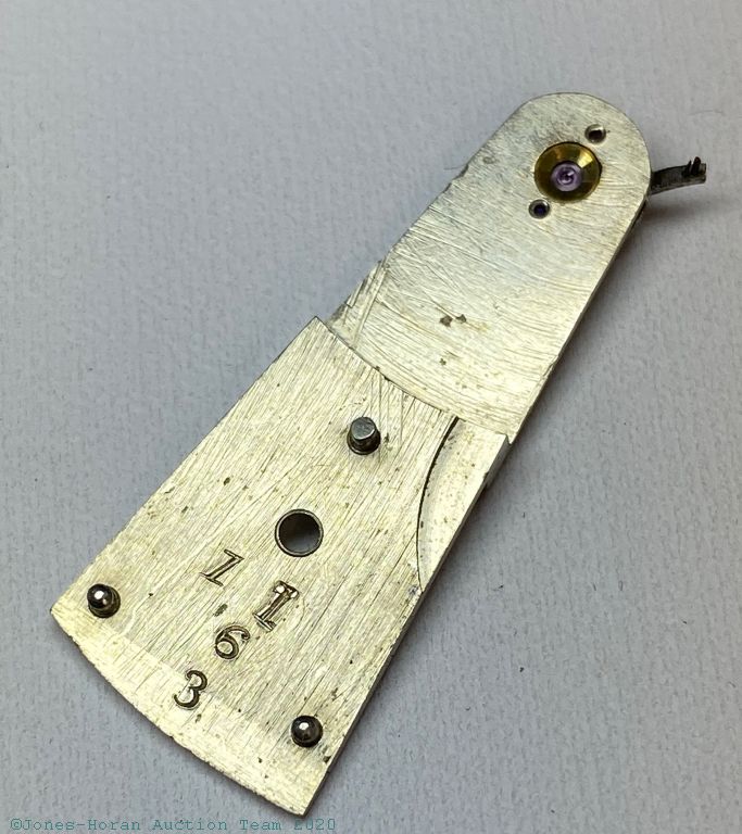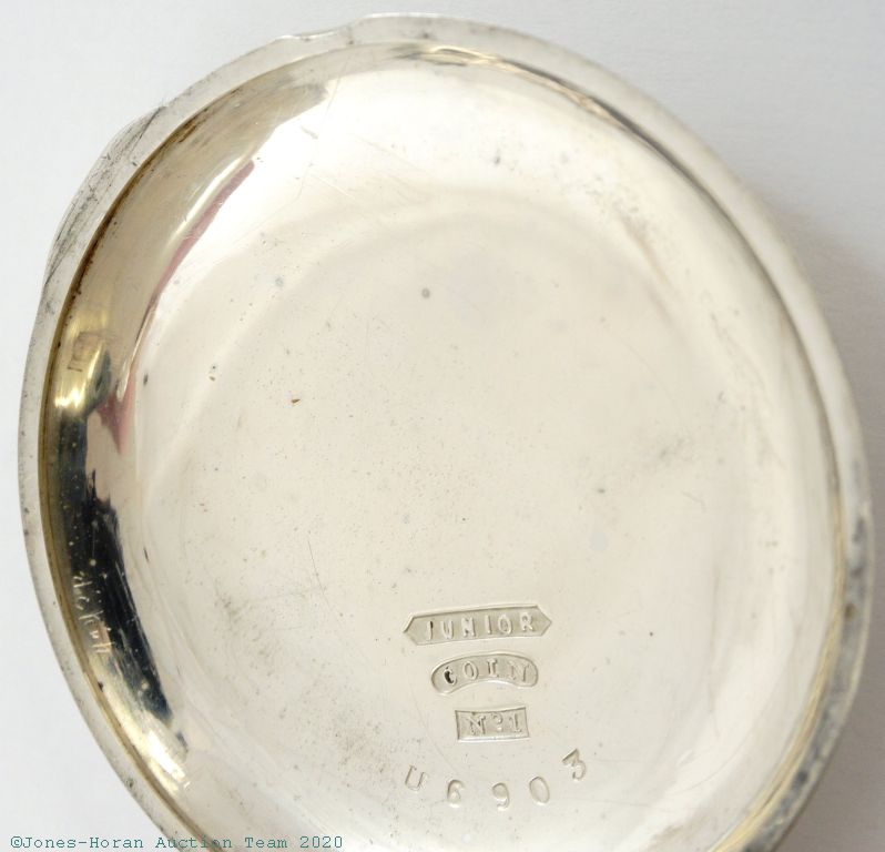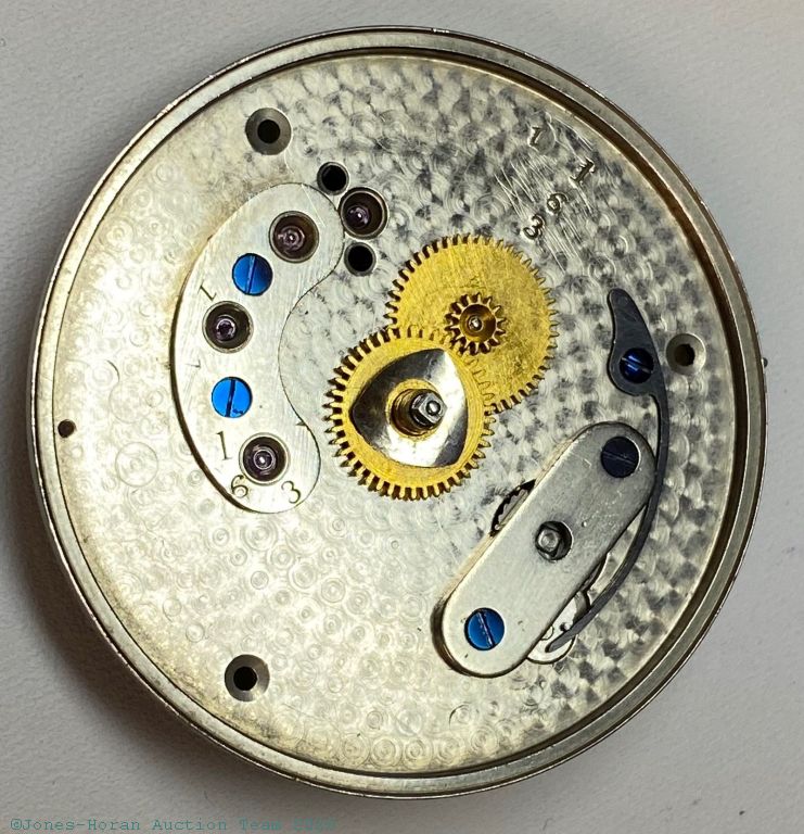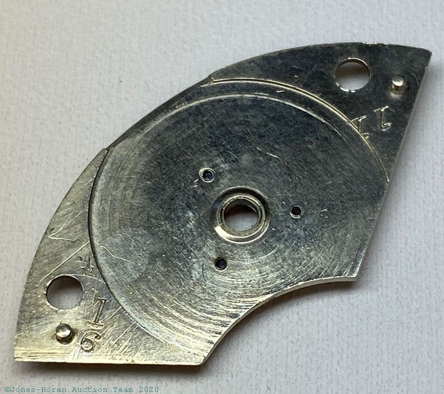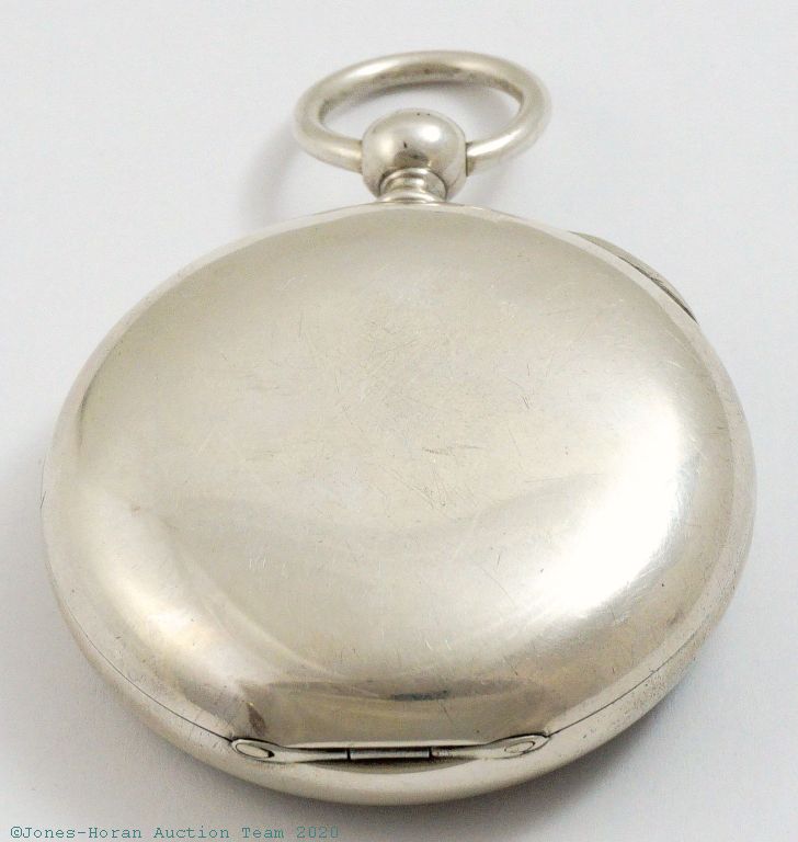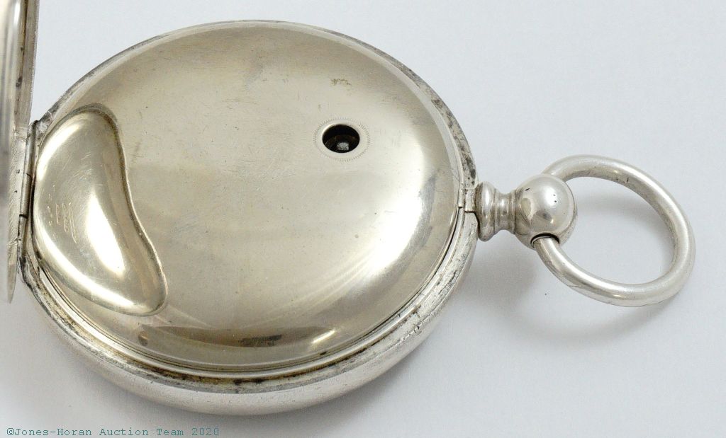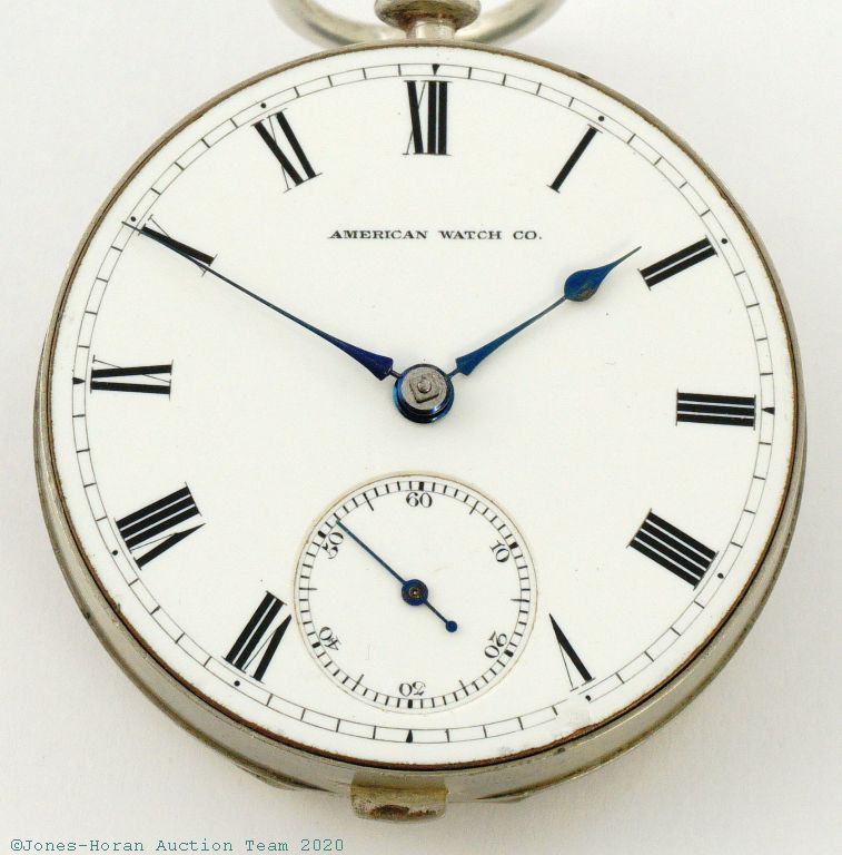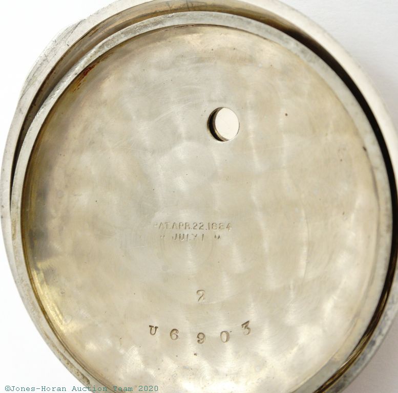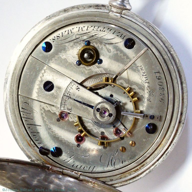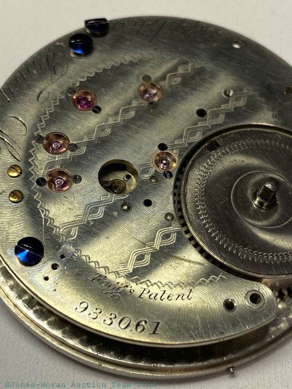 APW - Waltham, Appleton Tracy & Co, Model 1857, 16J, 18S, coin silver OF pair style recase, nickel cuvette, white enamel SS dial, KWKS, gold jewel settings, nickel damascene, s#933061. A very unusual and intriguing piece, this is the only example of a Model 1857 Appleton Tracy & Co. with nickel damascene finish that we have encountered. This movement also has notably atypical features of gold jewel settings and jeweling to the upper end of its center wheel arbor. Please see our comments in the condition report for observations from a partial disassembly of the movement.