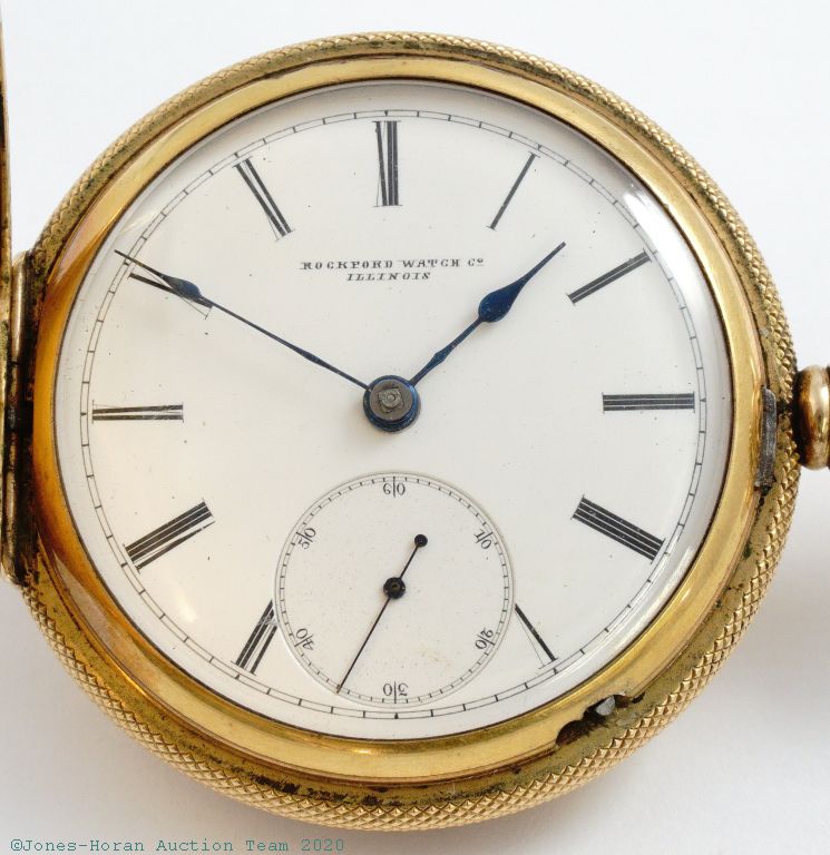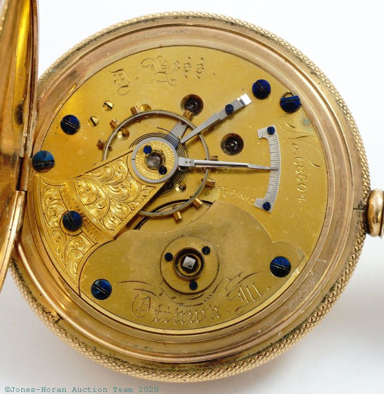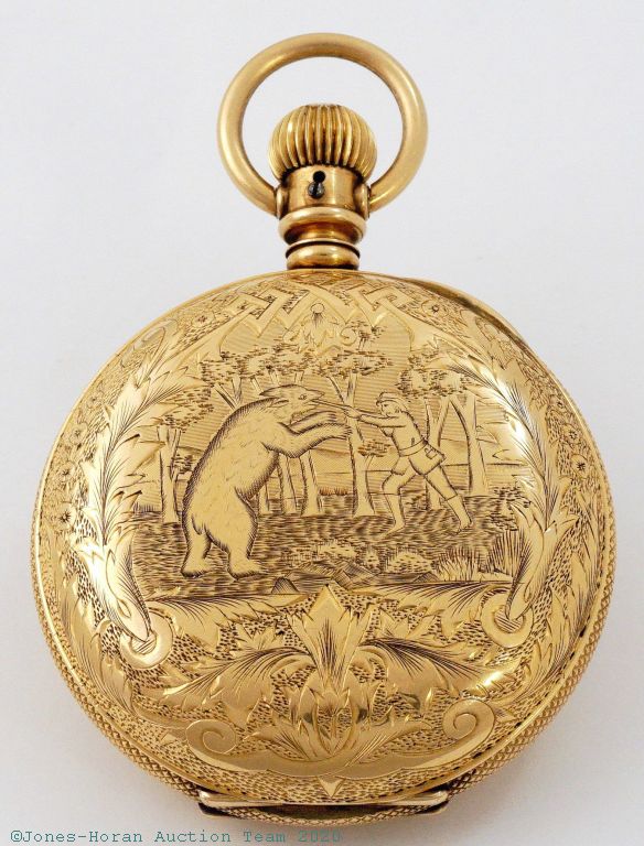 APW - Rockford, "D. Hess, Ottawa, Ill." marked mvt, 9-11J, Model 2, 18S, gold-filled G.W. Ladd HC with superb engraving detail, front with scene of locomotive passing in front of mountain range, rear with detailed scene of a hunter and bear in close quarters combat, white enamel SS dial, transitional style SW-LS with retained KW arbor, gilt mvt, s#68504.
