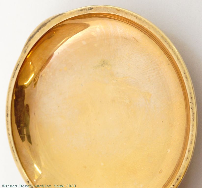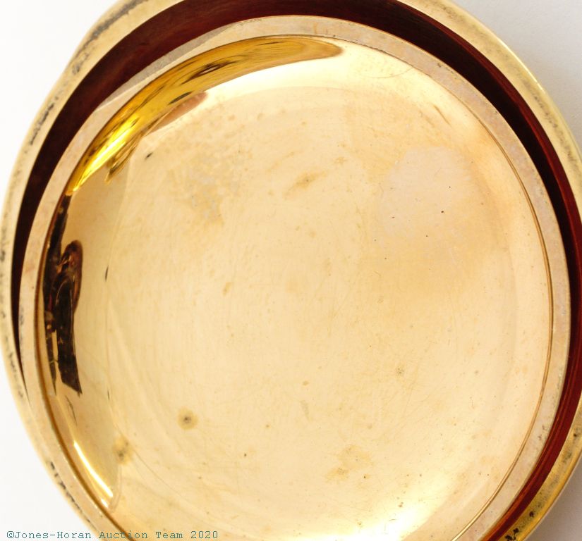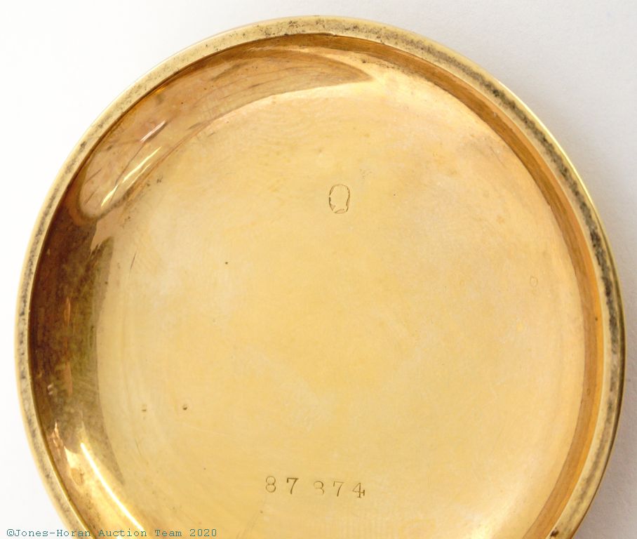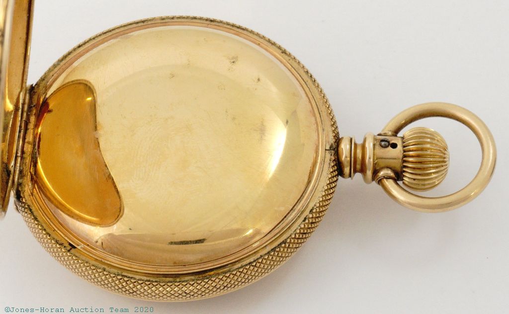 Mvt: NR, fully wound, balance is gummy, fine cosmetic mvt condition overall, discolored spot at perimeter of main plate near s#, haze spot near center of main plate, some light haze and scattered small spots in areas elsewhere; nearly flawless dial with micro-fine scratch near center; excellent hands; case shows hardly any wear, no dents or dings, superb engraving detail, bezel is virtually entirely brass with only minuscule traces of a gold layer, bezel and band have had lever-set slots widened to accommodate the present mvt, reverse of pendant with an extra hole for stem detent screw; tight bow, crown shows little wear; good glass crystal.