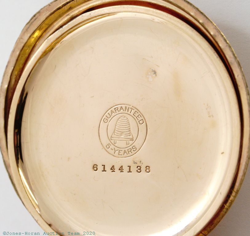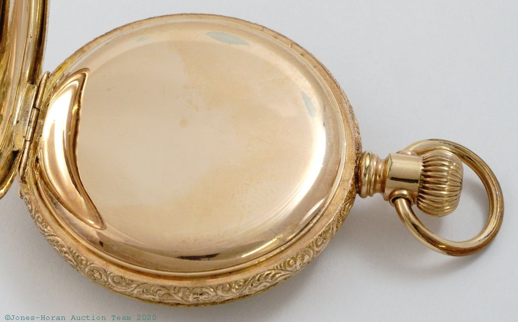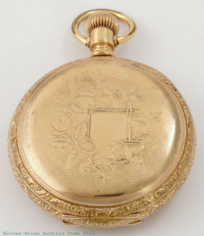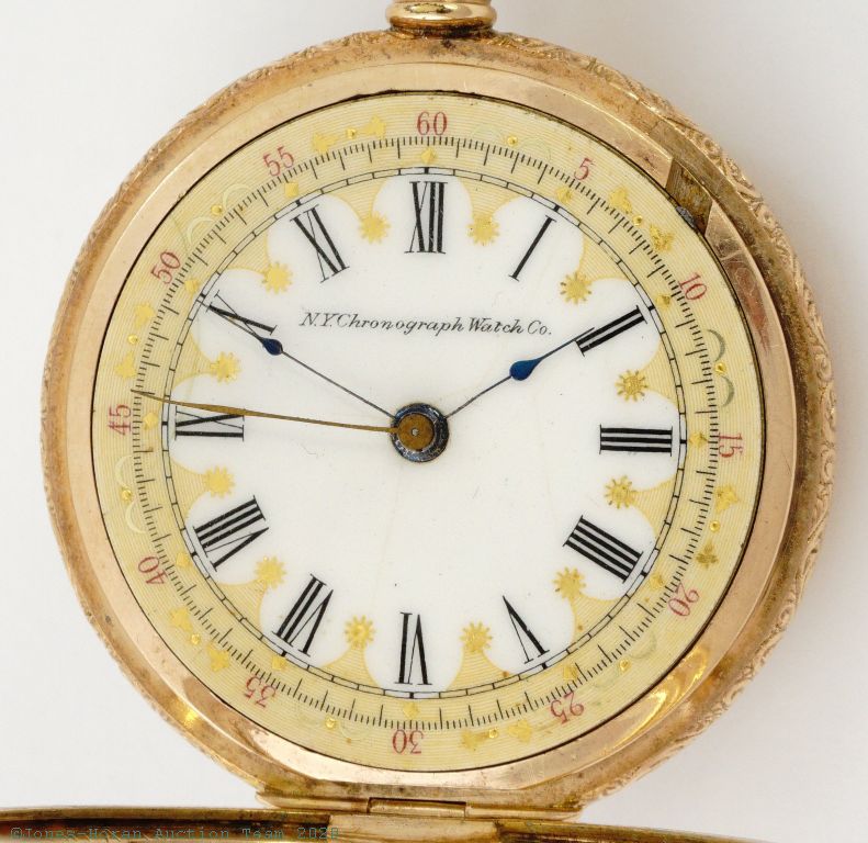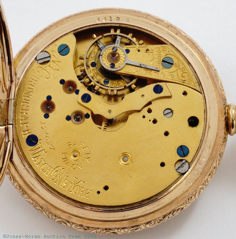 APW - N.Y. Chronograph Watch Co, New York, time only watch with center-seconds, 11-15J, 16S, 5 year gold-filled OF original case with attractive engraving detail, fancy white and yellow enamel dial with gold foil decorations, SW-LS, gilt mvt, s#174627. A good example of this scarce watch, it is believed that at most approximately 1000 examples of this 16 size N.Y. Chronograph Watch Co. model were produced with known examples having serial numbers dispersed through the 174,001 to 175,000 range. This example, like nearly all observed of the 16 size model, has a main plate that was machined to accept chronograph mechanism but is lacking chronograph components having been finished as a time only watch with center-seconds rather than as a chronograph. For further excellent info on this style of watch as well as others by Manhattan Watch Co. and N.Y. Chronograph Watch Co., we recommend Michael C. Harrold's excellent two-part article in the April and June 2010 issues of the NAWCC Bulletin.
