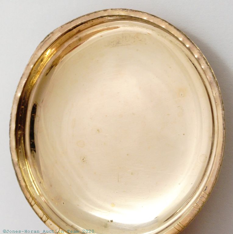Mvt: Ticking somewhat sluggishly, sweep-seconds-hand with choppy motion occasionally stalling and then skipping ahead two or more beats, overhaul recommended, excellent cosmetic mvt condition overall, some small fine scratches, regulator with some oxide, machined to accept a regulator spring but none is present; dial with scattered hls; fine hands, bend to tip of sweep-seconds-hand; case shows light wear, shallow denting to rear, reduced engraving detail, engine turning detail substantially reduced, slivers of wear to brass to raised ridges of case design and some spots of wear to brass to portions of high points of engraved detail; bow pivots freely, crown shows light wear; good glass crystal.