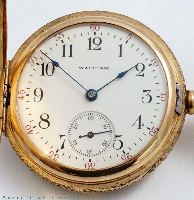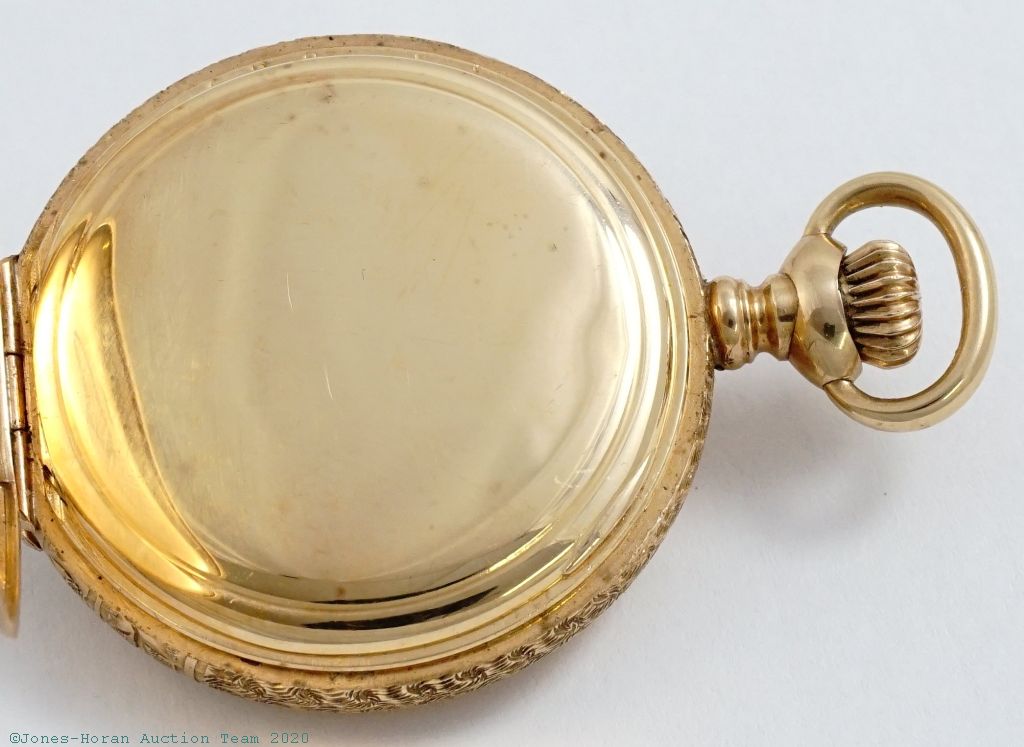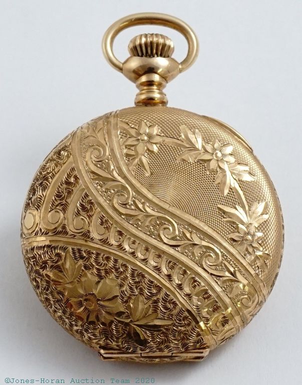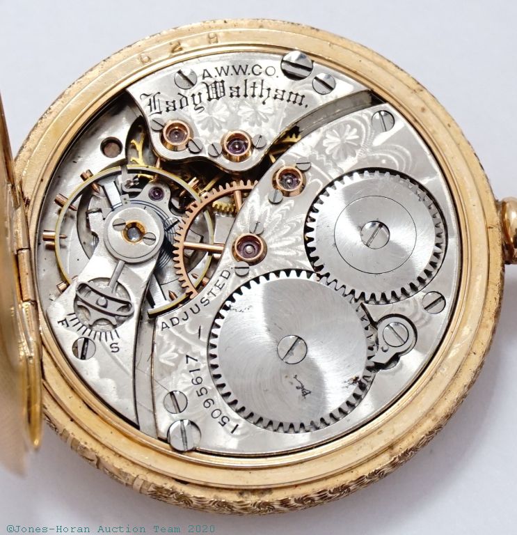 LPW - Waltham, Lady Waltham, 16J, 0S, 14K gold original HC with beautiful engine turning and engraving detail, gold cuvette, white enamel SS dial, SW-SS, nickel damascene, s#15095617. Gross weight of assembled watch 22.1 dwt (34.3 g).