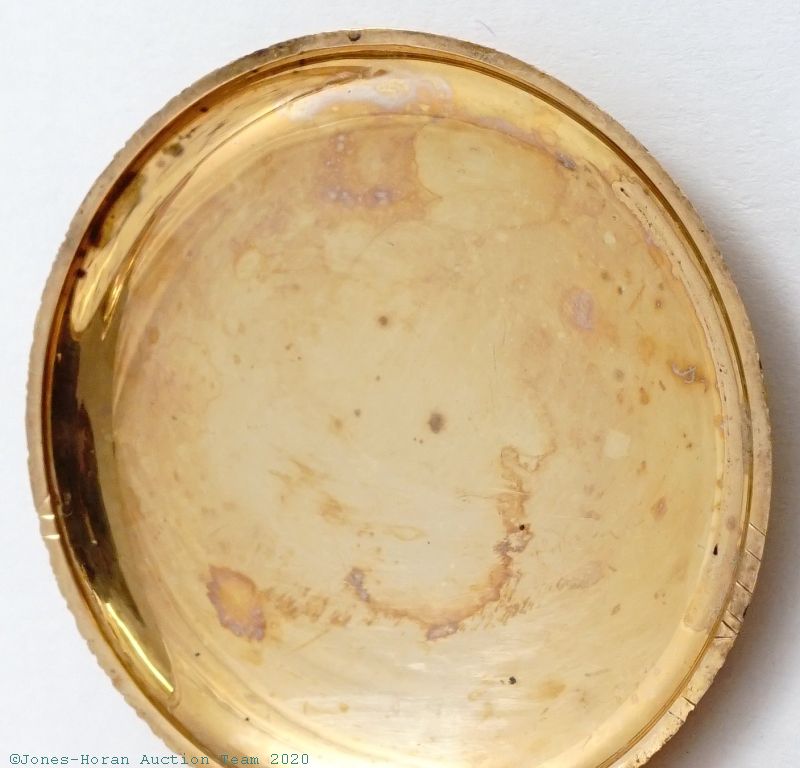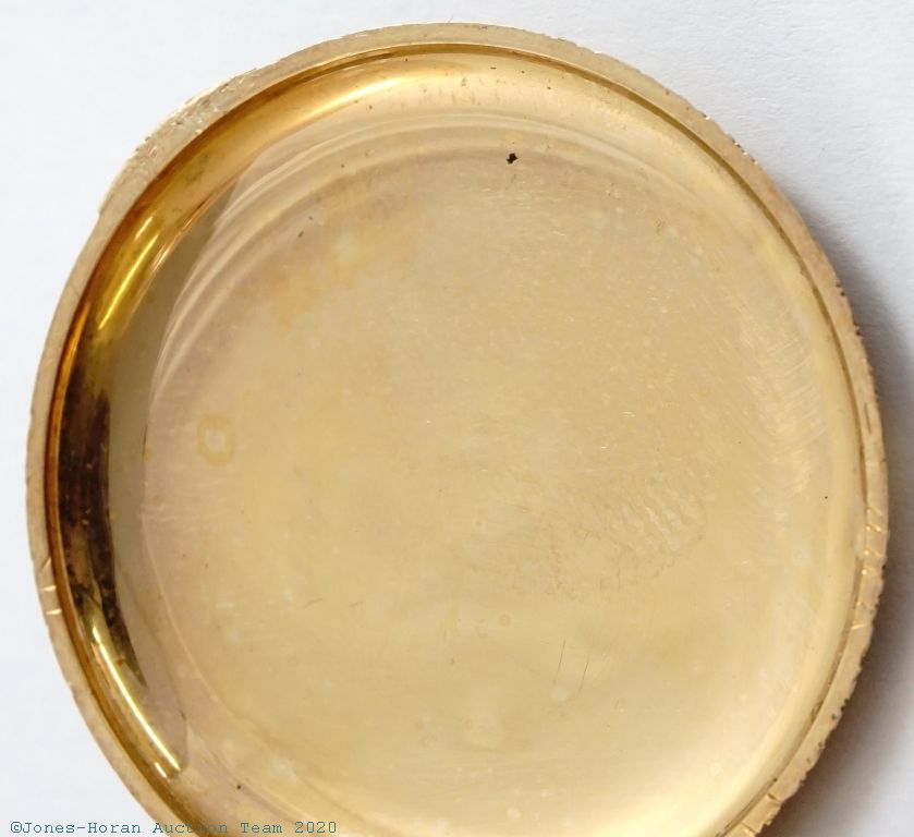 Mvt: Ticking very sluggishly on a full wind, overhaul needed, fine-plus cosmetic mvt condition overall, areas of oxide to larger winding wheel, few fine scratches; dial flawless within visible portion; fine hands, ample oxide to tip of minute; case shows virtually no wear, rear with some dings only evident to inner surface of lid, cuvette with small shallow dent toward perimeter adjacent pendant, superb crisp engine turning and engraving detail; tight bow, crown shows hardly any wear; good glass crystal.